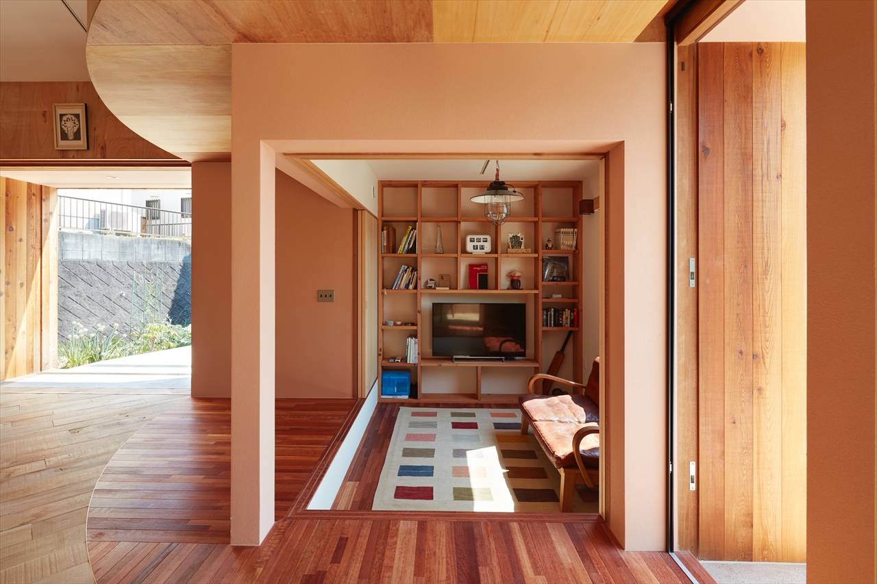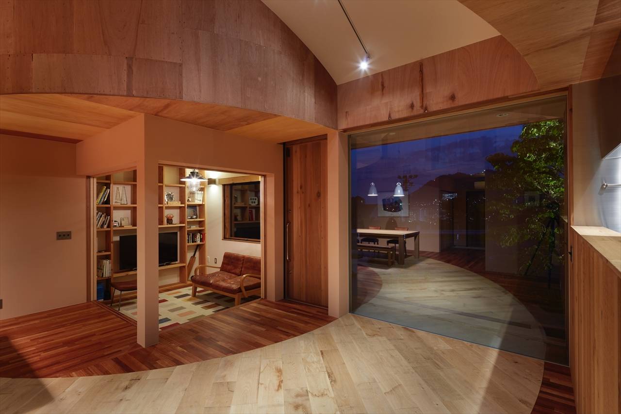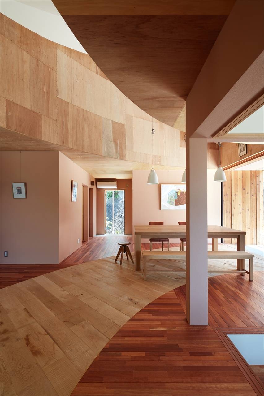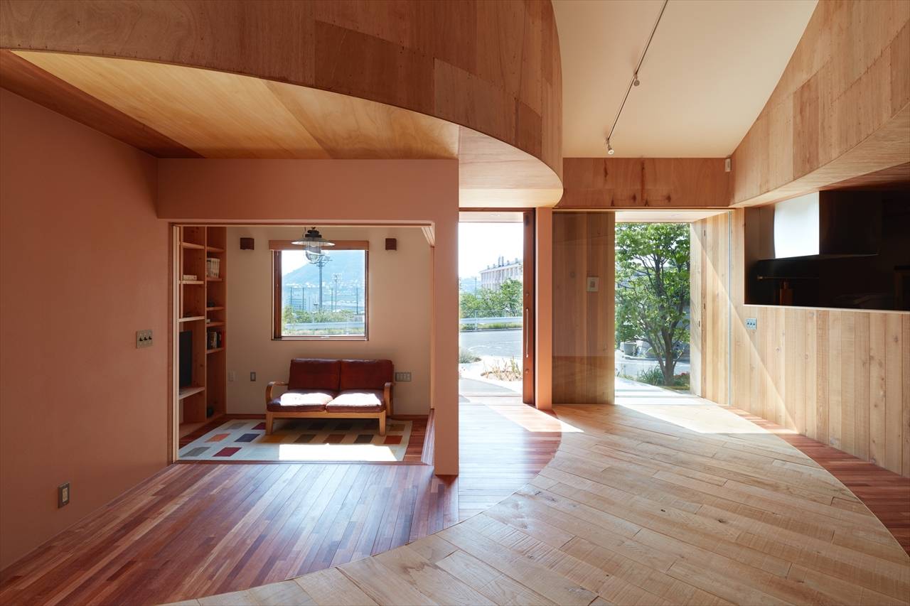広島市郊外の住宅街に建つ平屋の住まいです。 建築主は仕事の引退を機会に、畑として利用していた土地に、老後の住まいを建てることに。 住まいの希望としては、夫婦2人が暮らせ、植栽を育てることを楽しめる家としたい。 将来雑貨屋にもなり、ギャラリーやワークショップができる大きな空間があり、大きなテーブルを家の真ん中に置きたい、ということでした。 そのような希望から、住まいの外に並木道がある家を提案しました。 建物の外に、家と繋がる幅広い土間をつくり、その土間の中や周囲に草花や木を植えることで、小さな並木道がある住まいです。 並木道は住まいと円形に繋がっています。 また、元々あったミモザの木に愛着があるとのことで、それを生かした計画としています。 敷地の道路側に広がる眺望、南面からの採光と、隣地からのプライバシーのバランスを考え、建物配置を少し斜めに配置しています。 人が集まることを考え、キッチンはオープンに。 書斎も建具を開けるとリビングダイニングと一体になり、広く使えるようになっています。 建築後、近くに住む建築主の父や母、お子さんなど、皆が集う家となっているそうです。 これから、植物の成長とともに、住まいの様子も変化することを楽しみにしています。