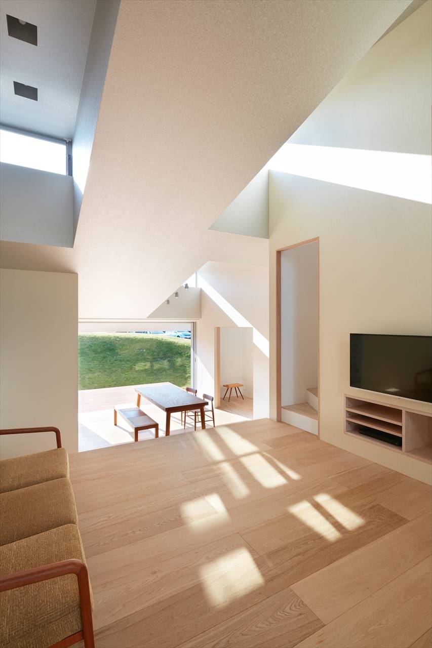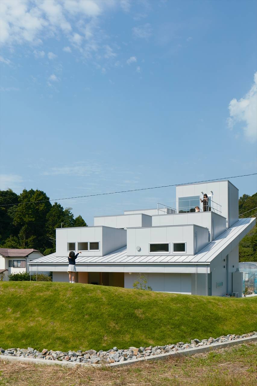 幹線道路側に残土を利用した築山をつくることで、道路からの視線や音を遮っている。 屋根部分から2階の各部屋を飛び出させることで、各居室に南からの採光を確保し、プライバシーを守りながらも、採光と通風に優れた計画としている。