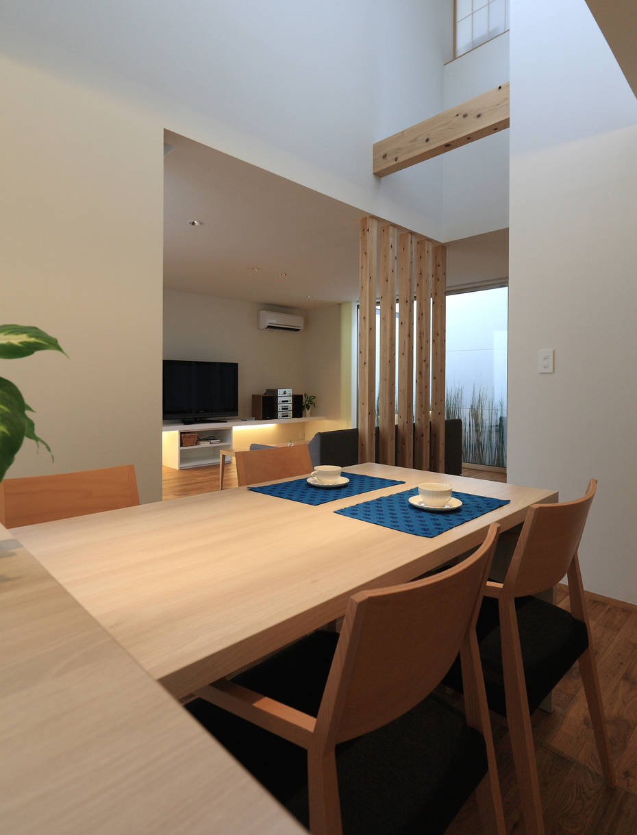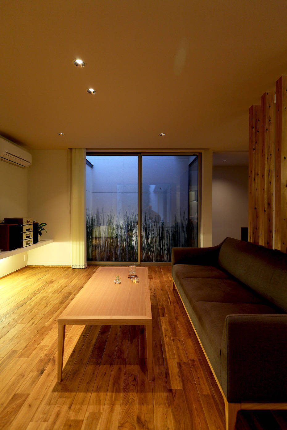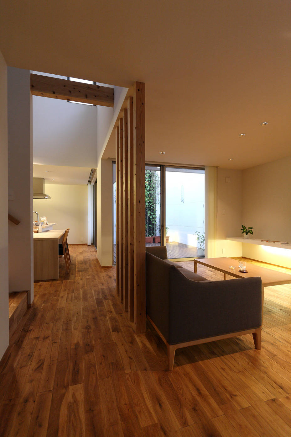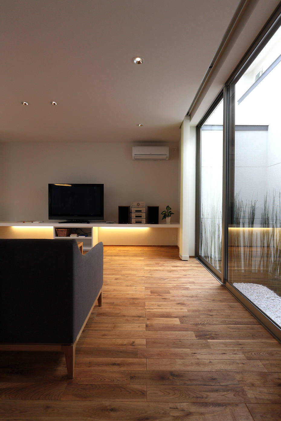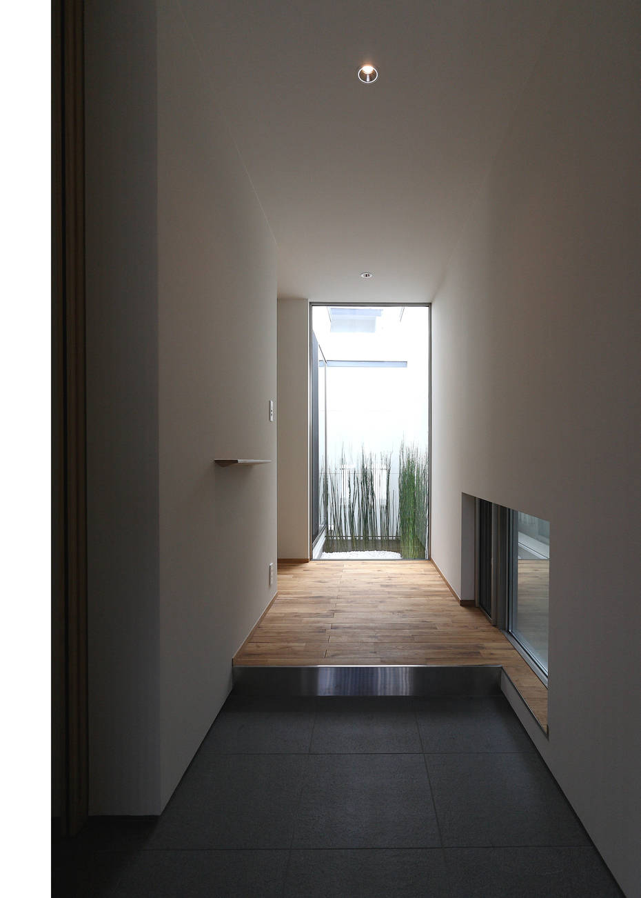 福岡市城南区の住宅街、40坪程の敷地に建つ3人家族の為の住宅。隣地からの視線、入りにくい太陽光をいかに効率良く取り込むかを考え、外壁で囲まれた3つの中庭がそれぞれ室内に光とプライベイト空間をもたらせてくれます。