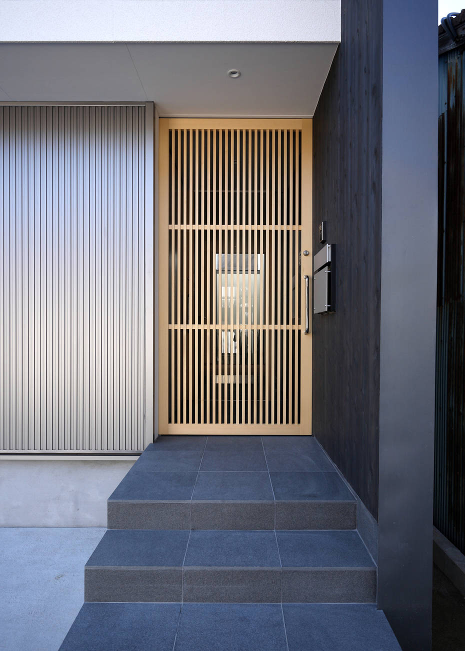 1階部分は耐候性のあるガルバリウム鋼板の外壁、2階部分は塗装壁の外壁のズレを意識した構成としています。