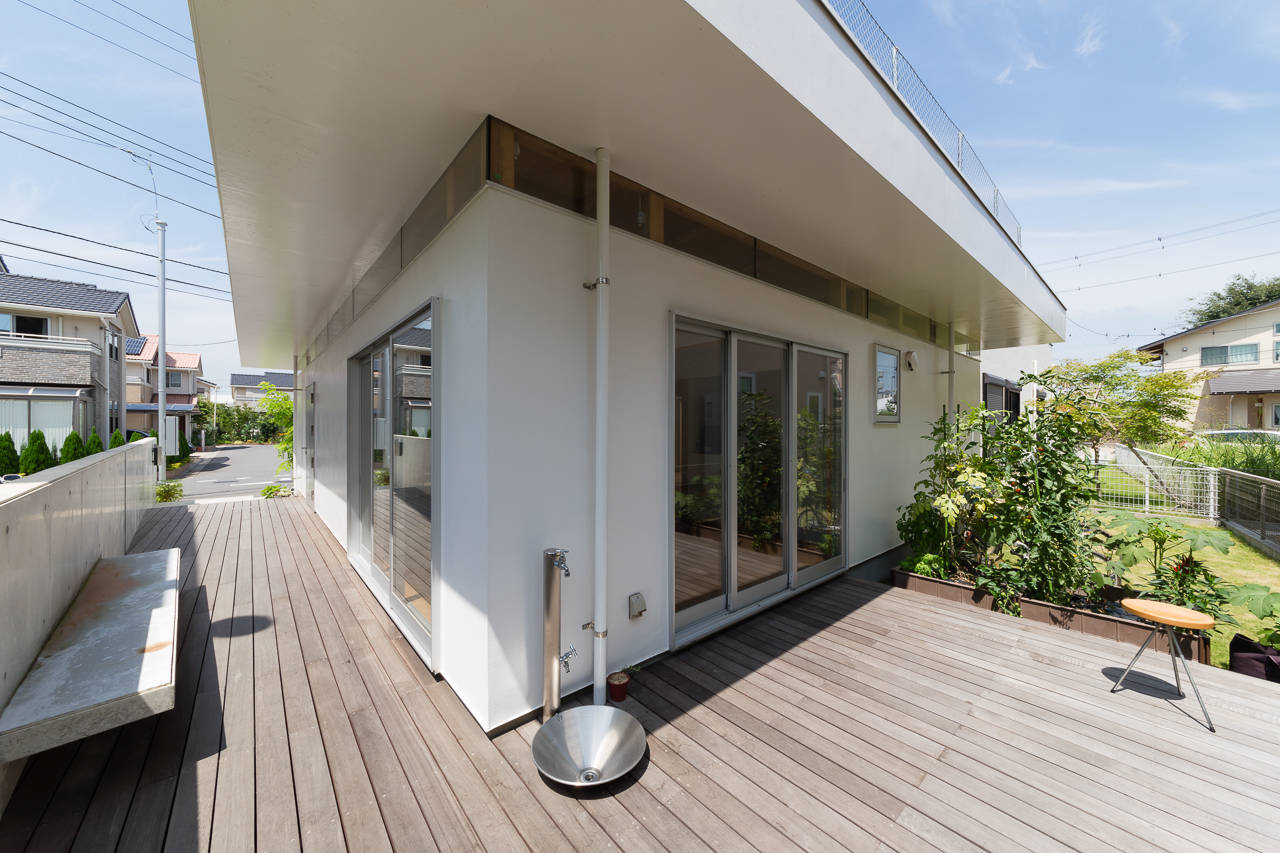 千葉ニュータウン駅に程近い、新興住宅地に建つ住宅です。建物を敷地のほぼ中央に配し、1階にはどの面にも直接外とつながるウッドデッキを設けました。床と屋根を浮かせたような外観の構成は、内部にもそのまま反映され、構造が露出した大きな天井を共有するワンルームのような室内を、天井まで届かない白い壁が、緩やかに分節しています。