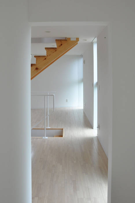 平面形に呼応する斜めの壁が、半地下から2階まで3層をつなぐアクセントとなるとともに、室内からの視線を空へと誘っています。