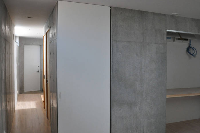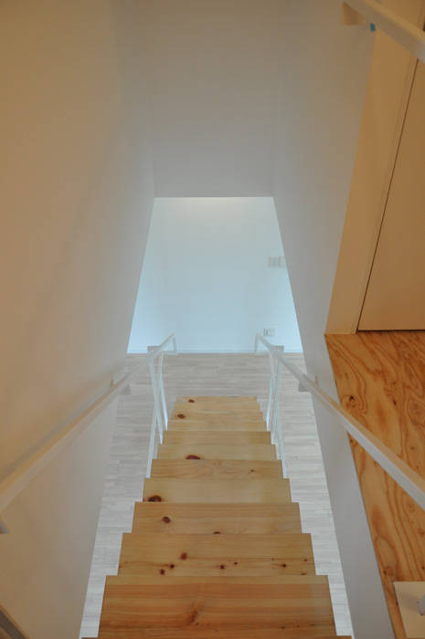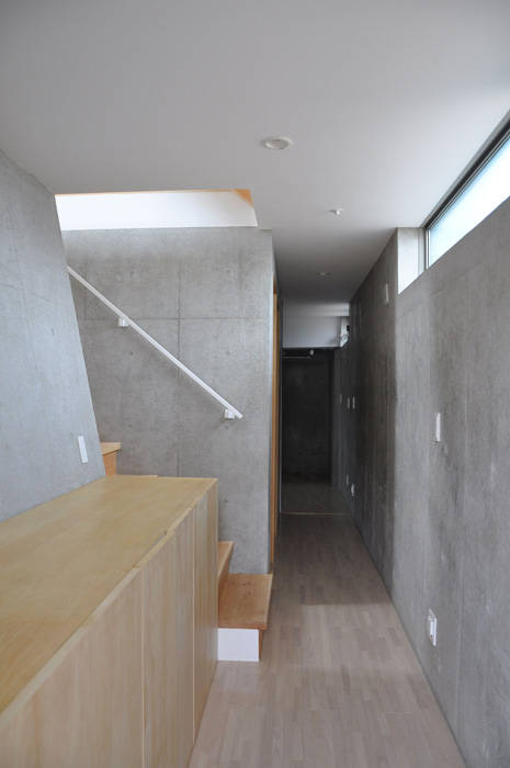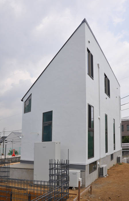北側斜線の厳しい住宅密集地ですが、斜線に呼応して南側に向かって広がる台形の平面とすることで、住宅として適度な幅を保ちつつも、気積を最大限確保しています。また、台形の平面形によって外部に余白が生まれ、近接する隣家との緩衝帯となっています。