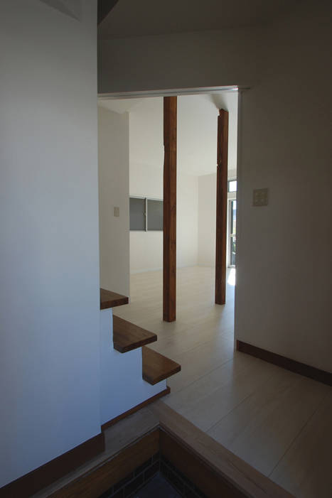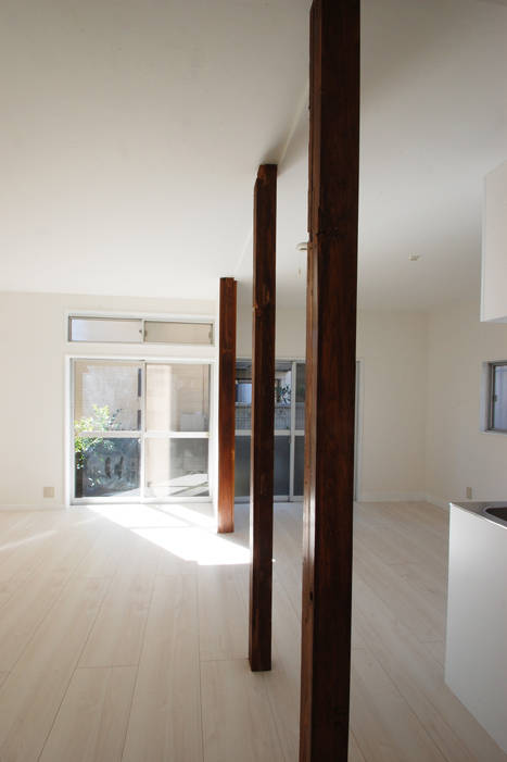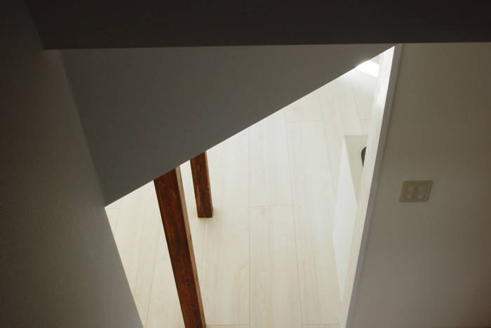 壁1枚撤去+斜め垂れ壁挿入というわずかな操作により、当初個別となっていたリビング・ダイニング・廊下が緩やかに繋がり、まとまりのある空間となっています。斜め垂れ壁が新旧の境となりますが、既存の階段と新空間に残された木柱が呼応し、新旧が程よく混ざった居心地のよい空間です。