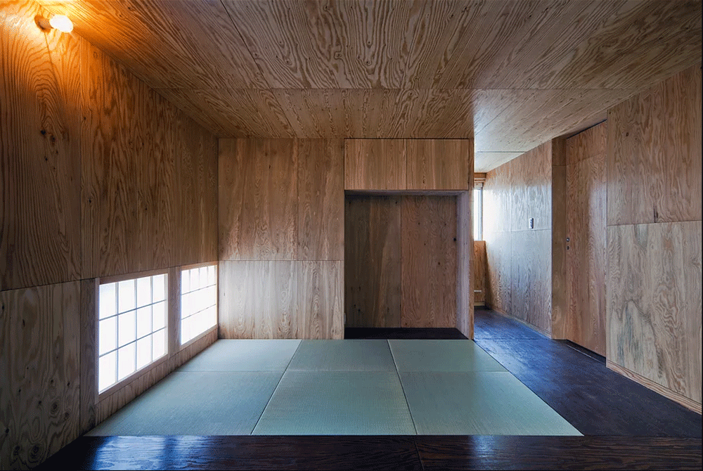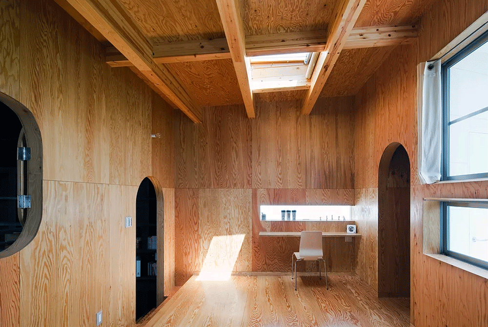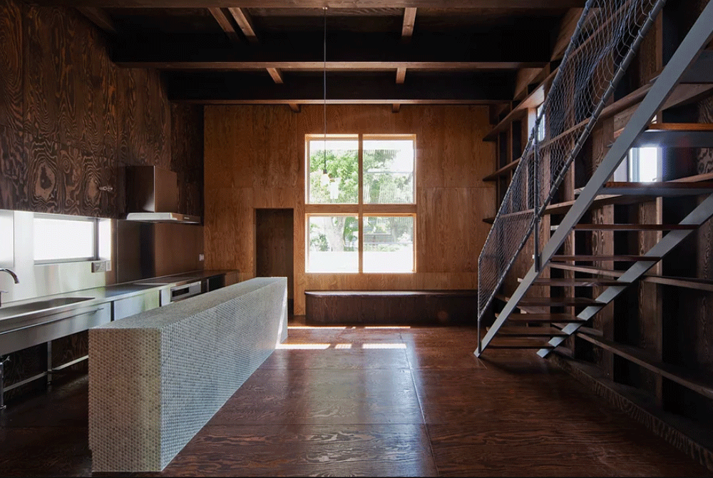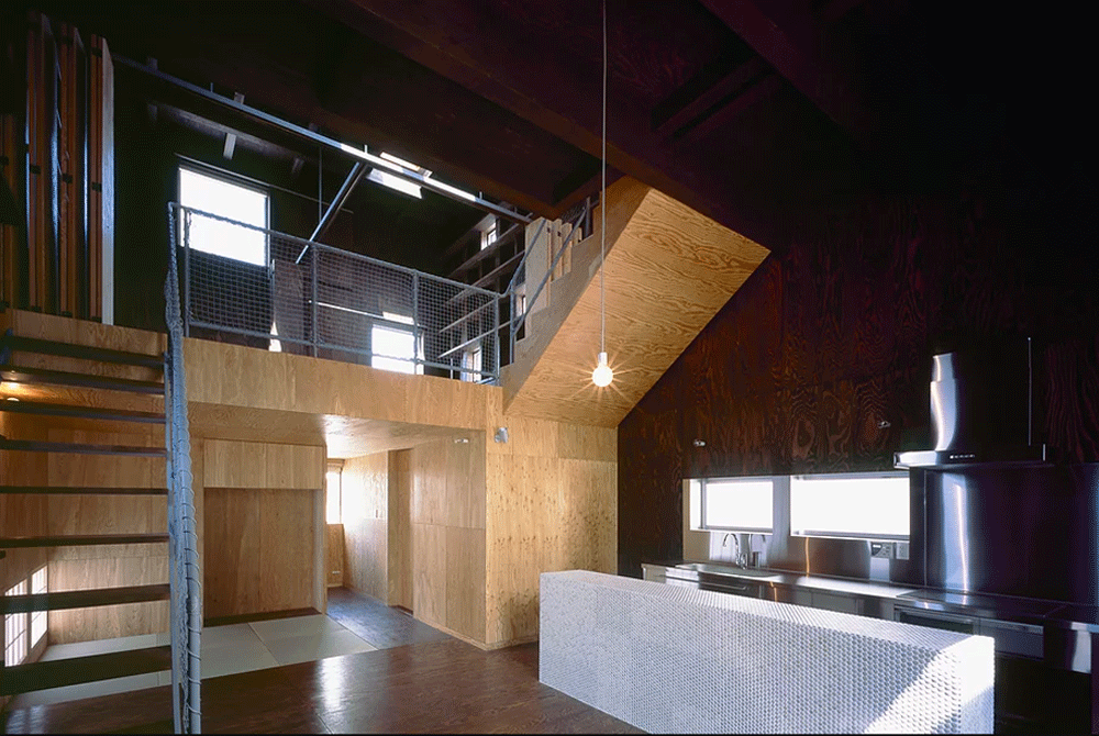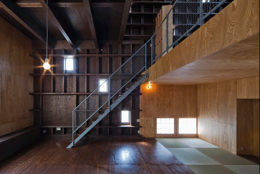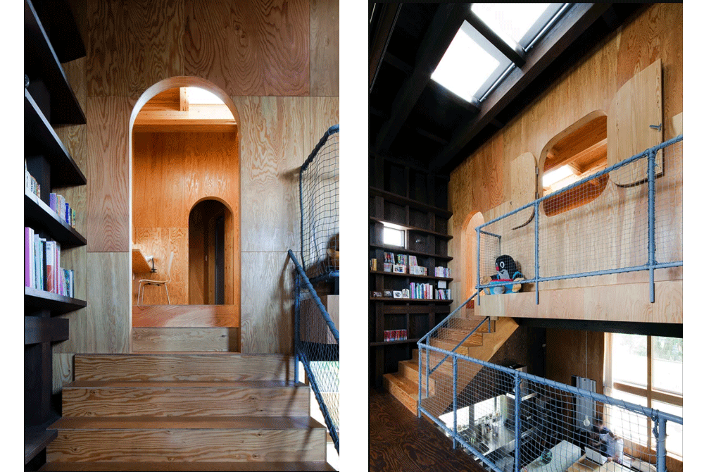 依頼主からのご要望は、パリのアパルトマンのような感じ。それと、本棚がほしい。と印象的なものでした。僕のもつパリのアパルトマンの印象は、『天井が高くゆったりとした空間』それと『時とともに深みを増す素材』。出来上がった空間は、『高さ』と『素材感』を最大限生かした、スキップフロアの構成。それと東西面の壁いっぱいまで利用された、壁面本棚。空間には、十字に縁どられた窓から届く、神社からの豊かな緑。トップライトからの光など、光・風・緑が感じられる、素敵な空間となりました。時が経つにつれ家族と共に、より深みを増していくことを心から願っています。