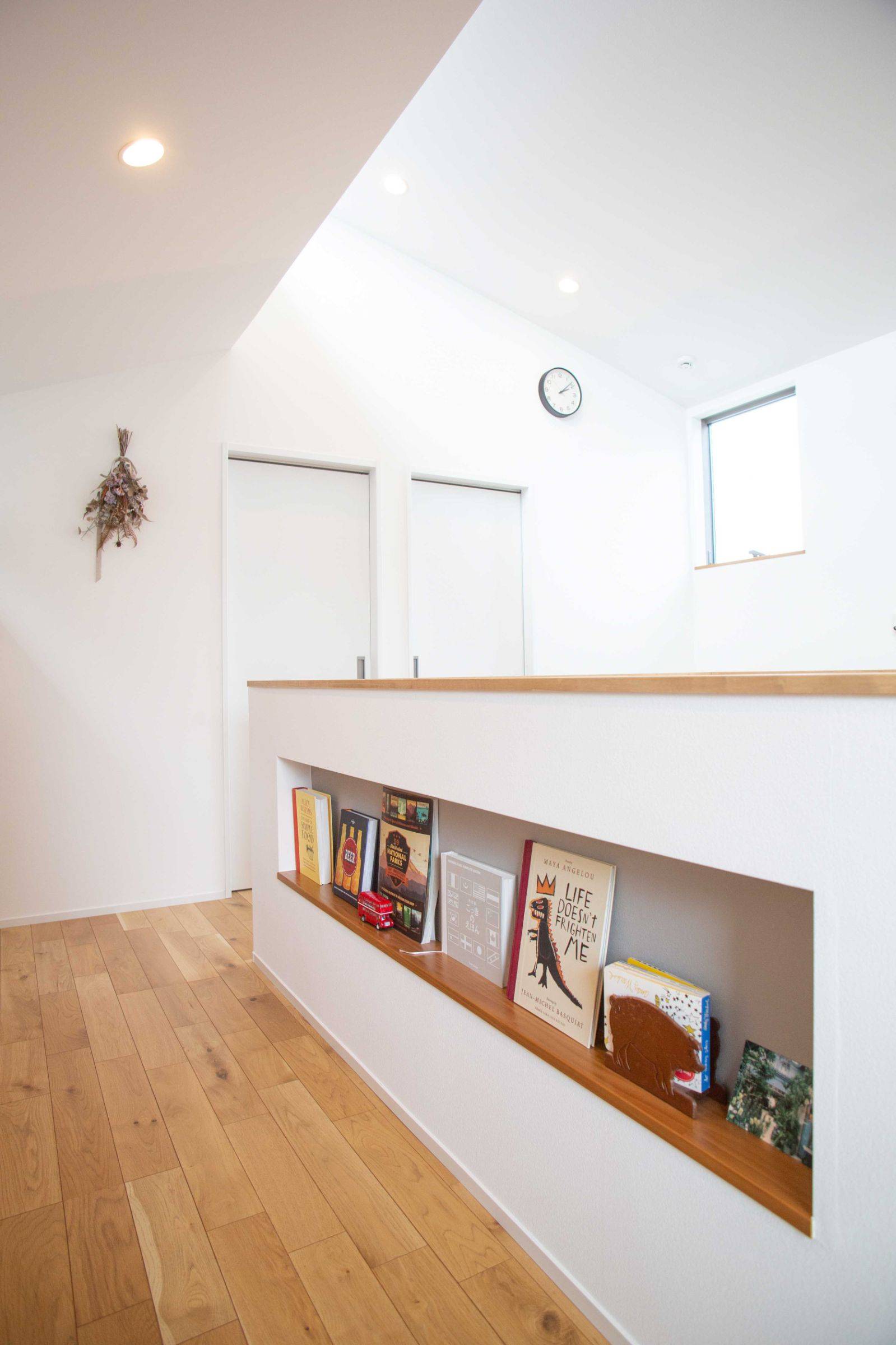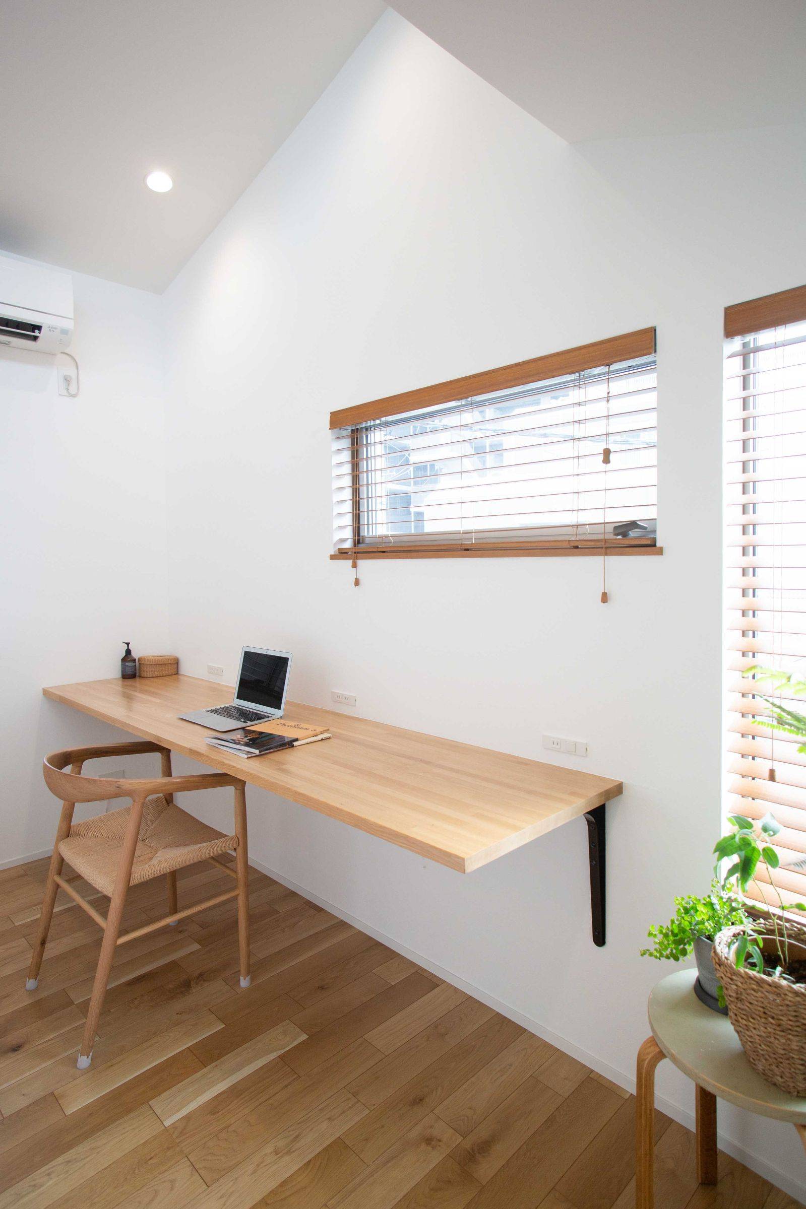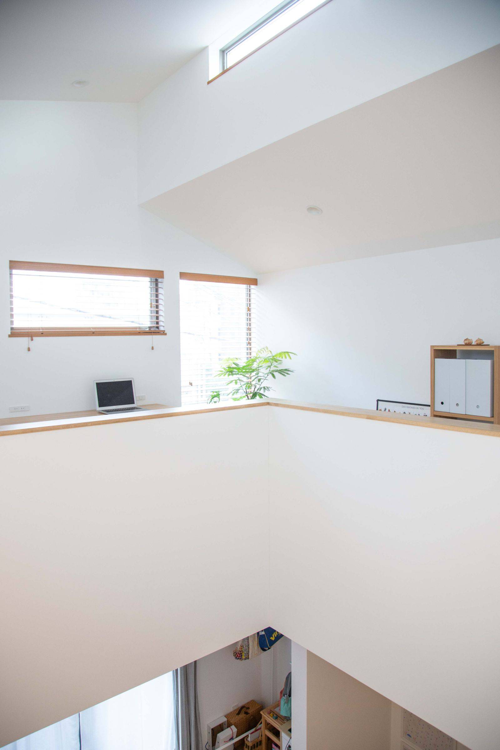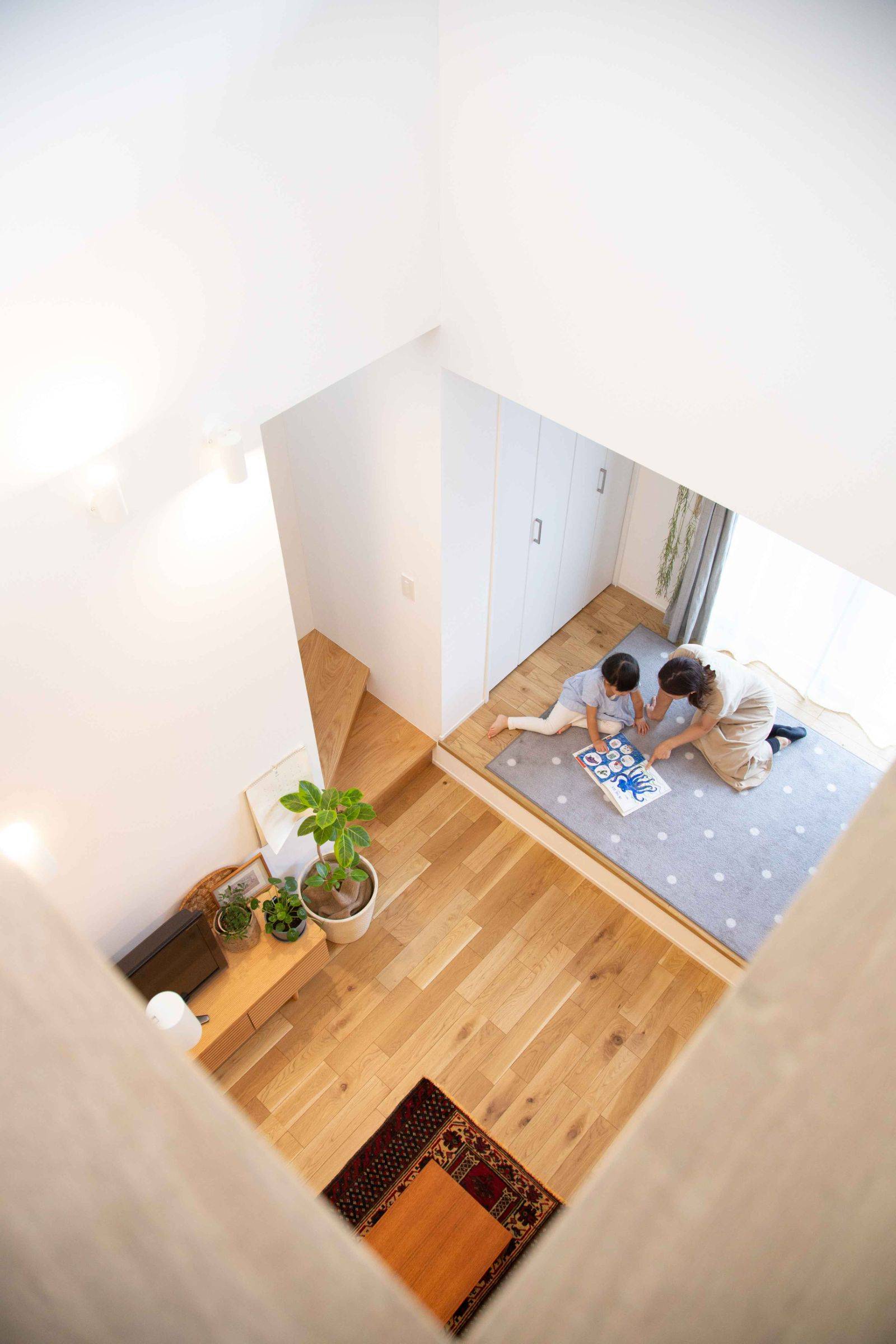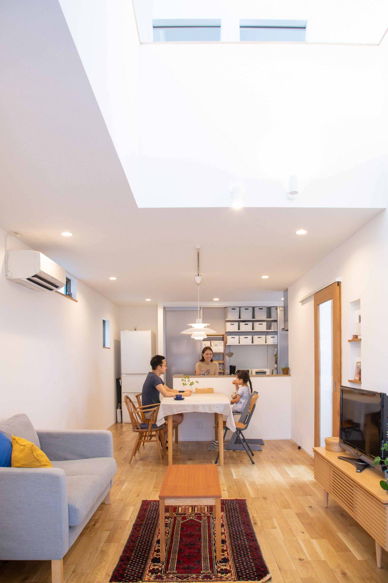 前述の様な敷地条件のため建坪を大きくとれないことから、3階建てとして、1階に寝室や水廻りなどのプライベートスペース、2階に3階と繋がる吹抜けを持つLDK、3階に家族3人で仲良く並んで座れるスタディコーナーをそれぞれ計画しました。メイン空間となるリビング上部の吹抜けから採光が取り込める様、3階にハイサイドライトを設けています。ふんわりと柔らかい光が落ちるひだまりのような空間を目指してデザインしました。