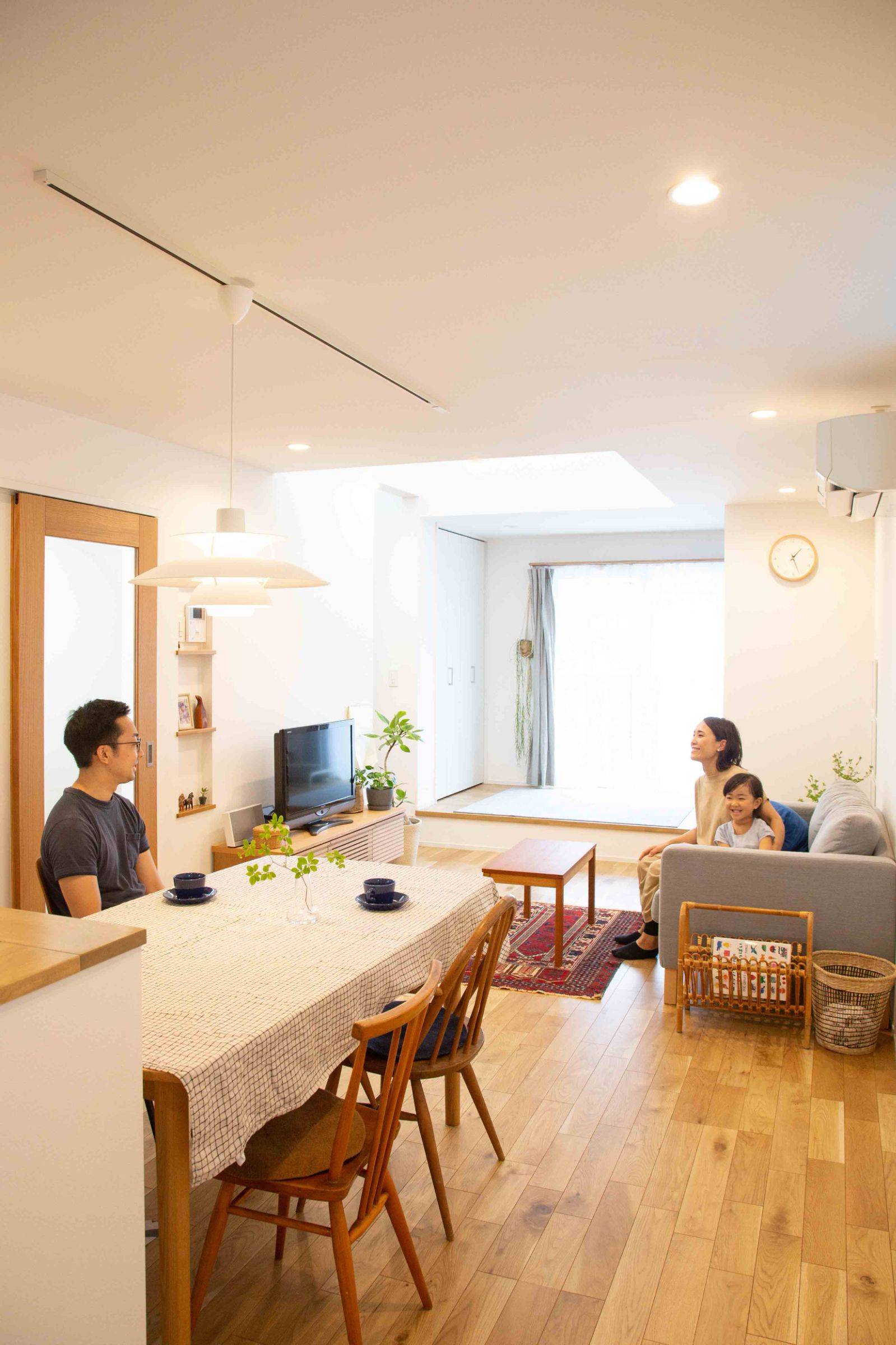 敷地は都内の分譲地で最寄り駅からは徒歩5分の好立地に建つ、ご夫婦と小さな娘さん3人のお住まいを設計させていただきました。とても素敵なご夫婦で、雰囲気が柔らかくてセンスもよく、なによりお子さんがとても可愛くて、打ち合わせにお伺いするのがいつも楽しみでした。