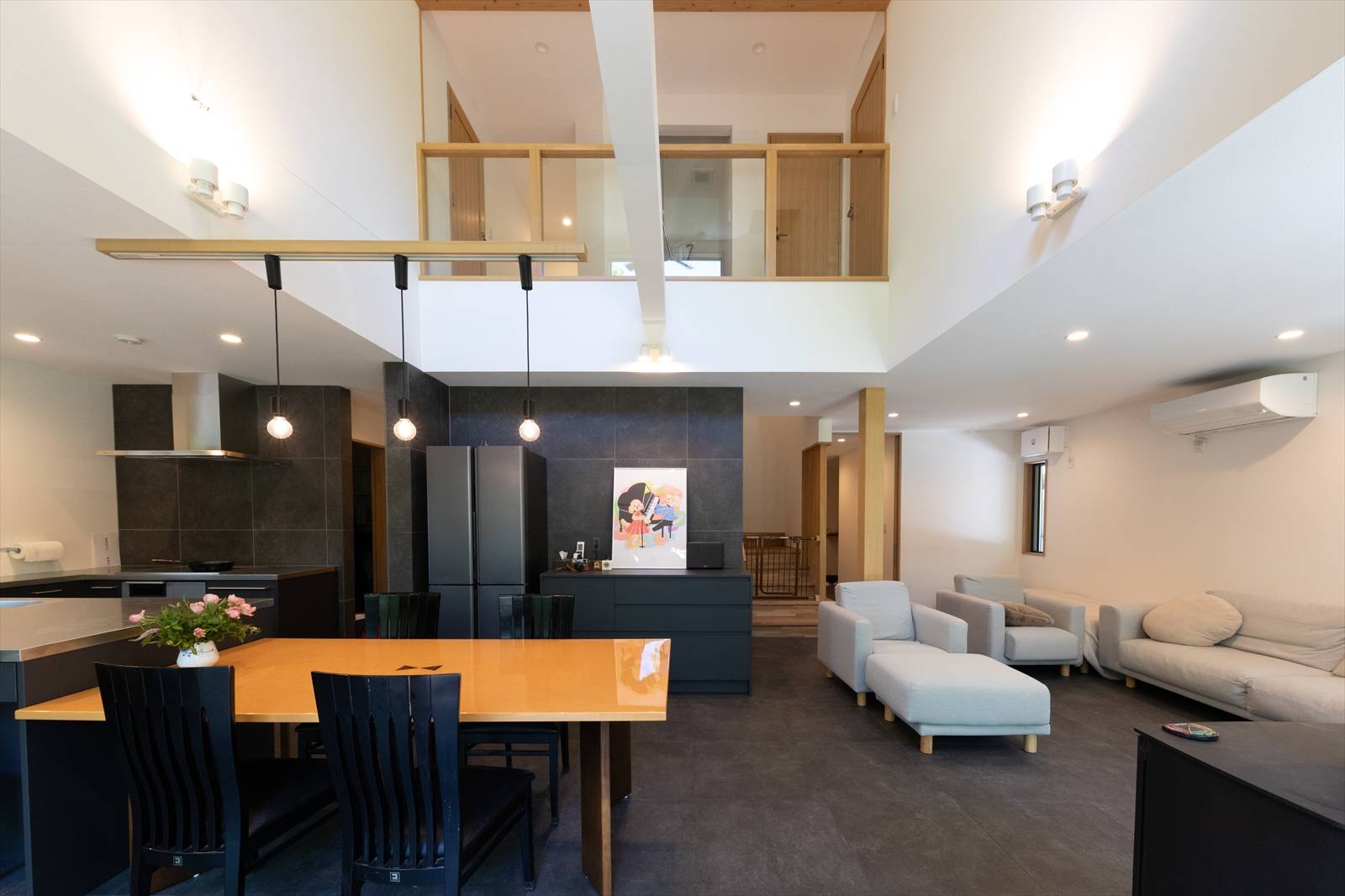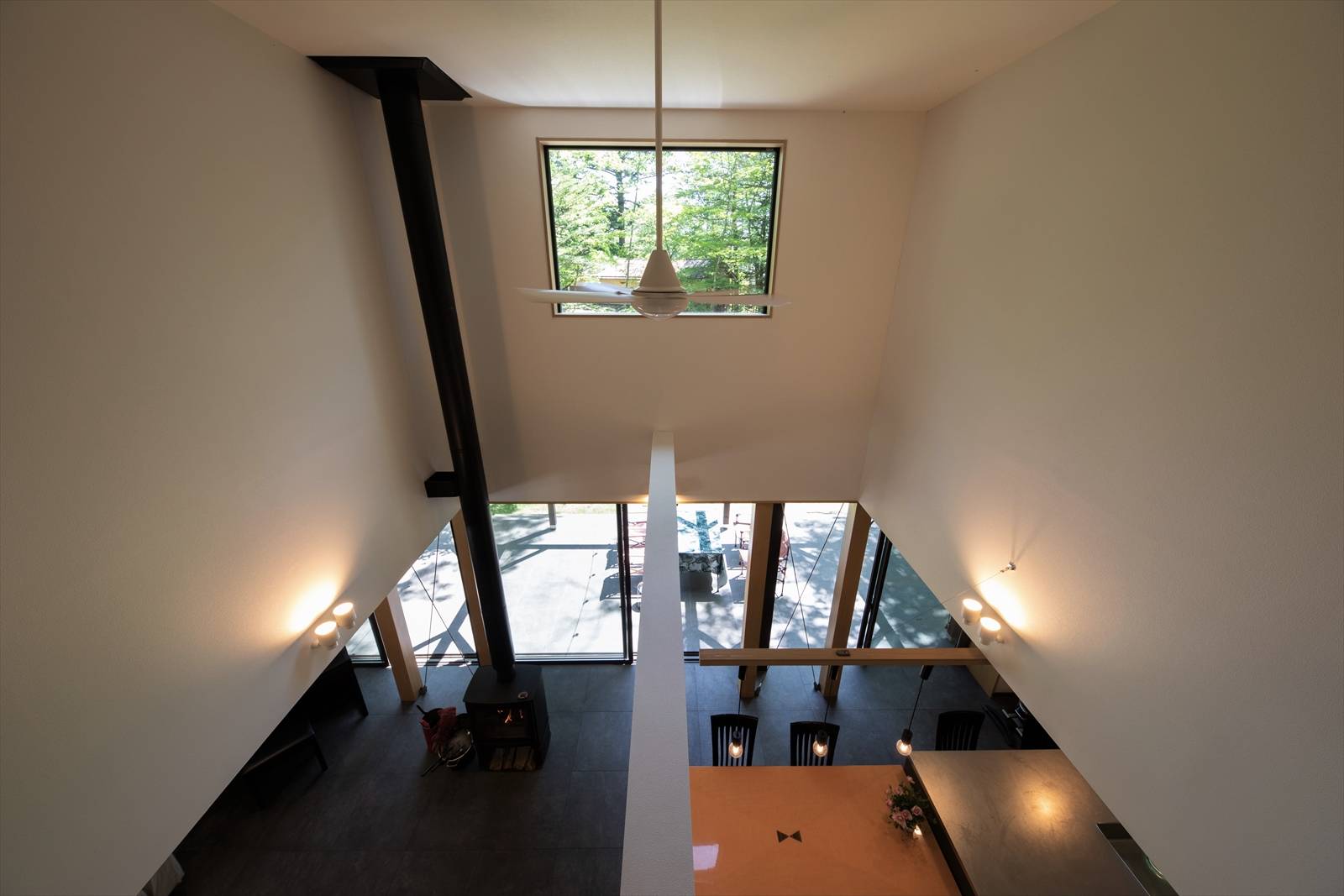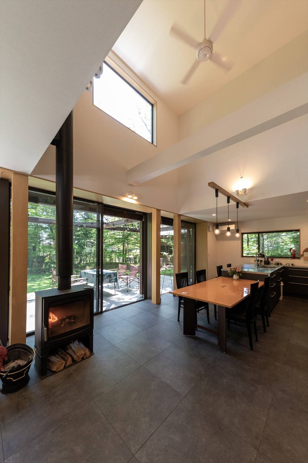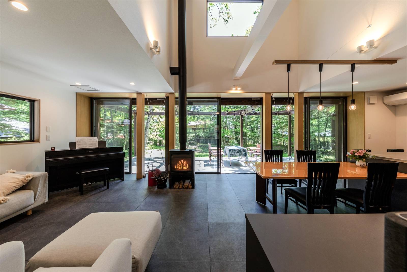 大きなモミやケヤキが点在する緑豊かな庭と室内を連続させるため、リビングダイニング前面に広いテラスを設け、全面開口による庭のパノラマビューと内外共通のタイル床によって空間の一体化を図りました。薪ストーブとピアノをリビング南側に設置することで緑の庭を背景に炎を眺めたり音楽を楽しむことができます。吹抜け上部のハイサイド窓やコの字型キッチン前の窓枠で切り取られた緑が絵画のようです。大きなテラス窓のある浴室はジャグジーに入りながら木々の枝葉や空の景色を楽しめます。