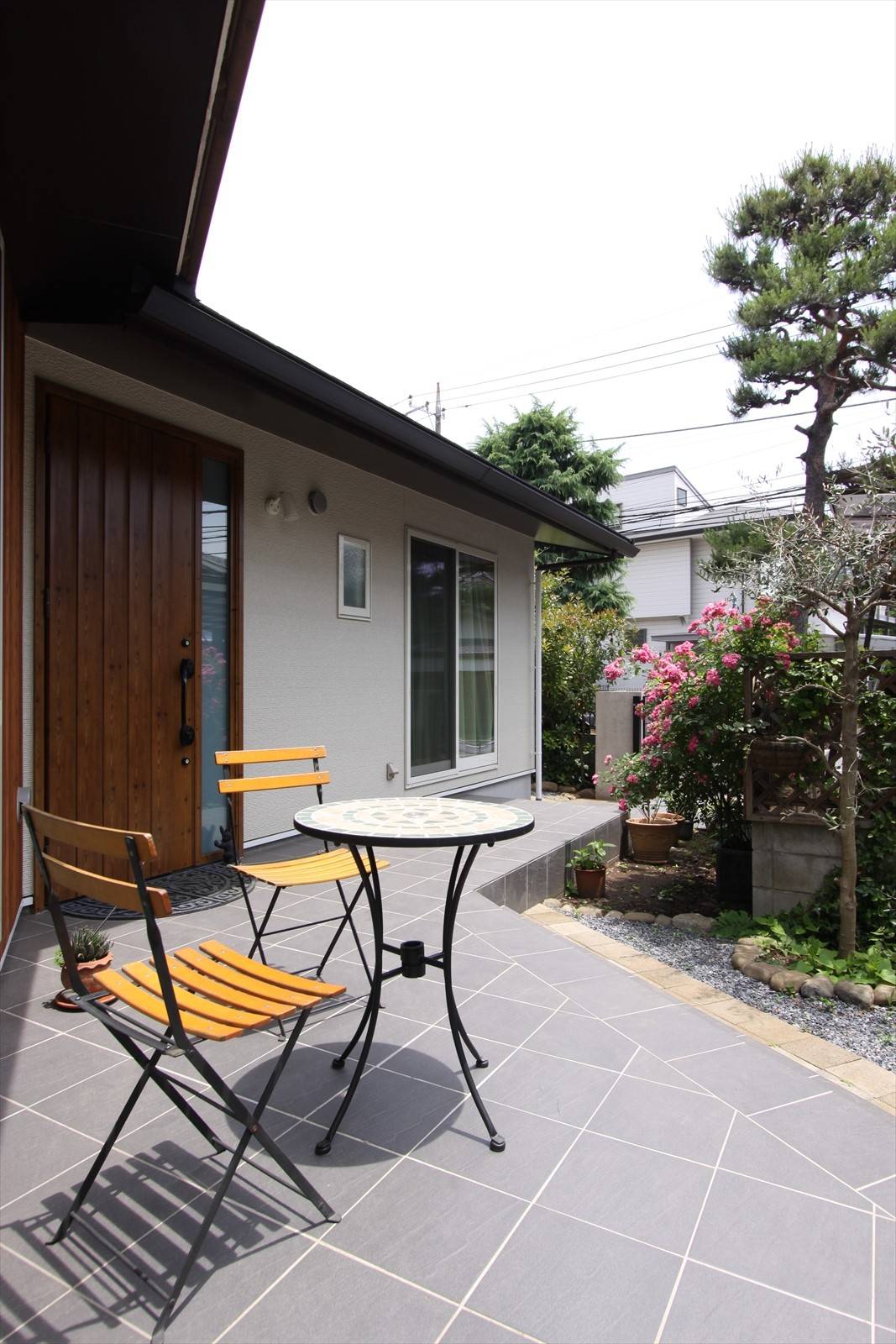 アプローチと連続したタイル貼りの広いテラスは近所に住むご主人様の幼なじみや奥様の犬友達が気軽に立ち寄れ、週末はここで乾杯という仕掛けになっています。