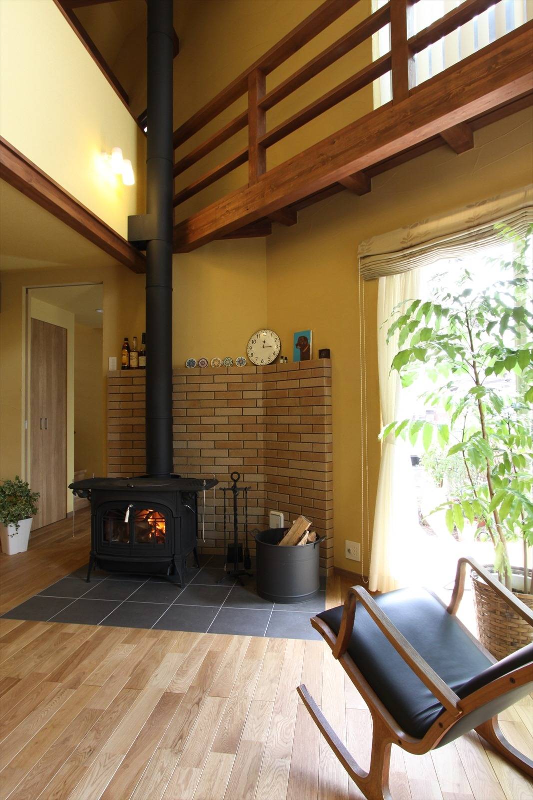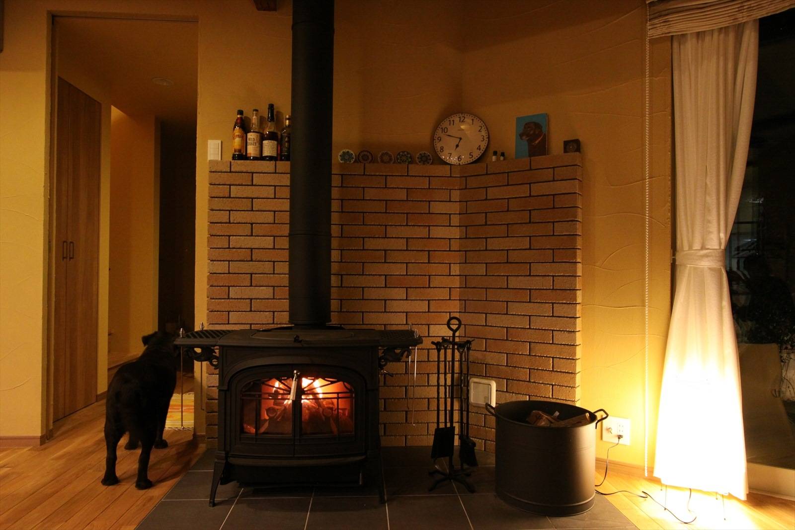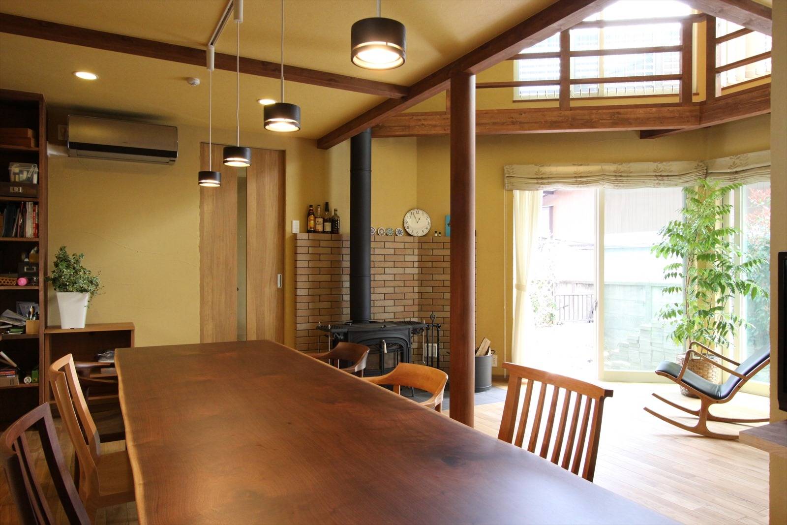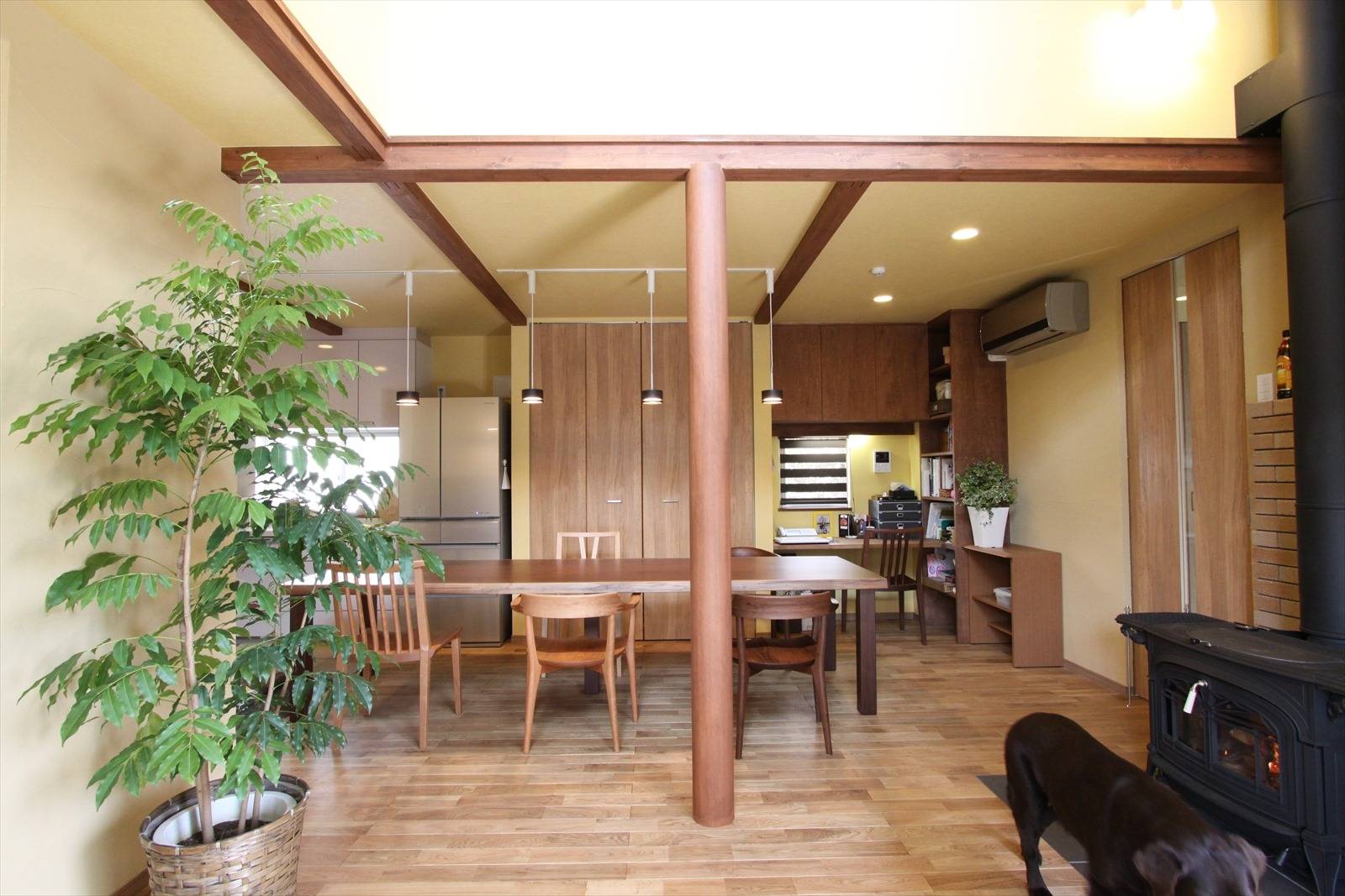 N様ご家族の最大のこだわりは大きな吹き抜けと薪ストーブと長さ3mの大テーブルです。家族と犬と猫がなんとなく集まりつつもそれぞれに思い思いの時間を過ごす・・・そんなのんびりした暮らしが展開するナチュラルな空間を目指しました。室内はサンドイエローの珪藻土壁とオークのフローリングとウォルナット調の柱梁の組み合わせでナチュラルな雰囲気を演出しています。また外壁にはウェスタンレッドシダーの木サイディングを採用し、まきストーブの煙突と相まって、外観もナチュラルな雰囲気を醸し出しています。