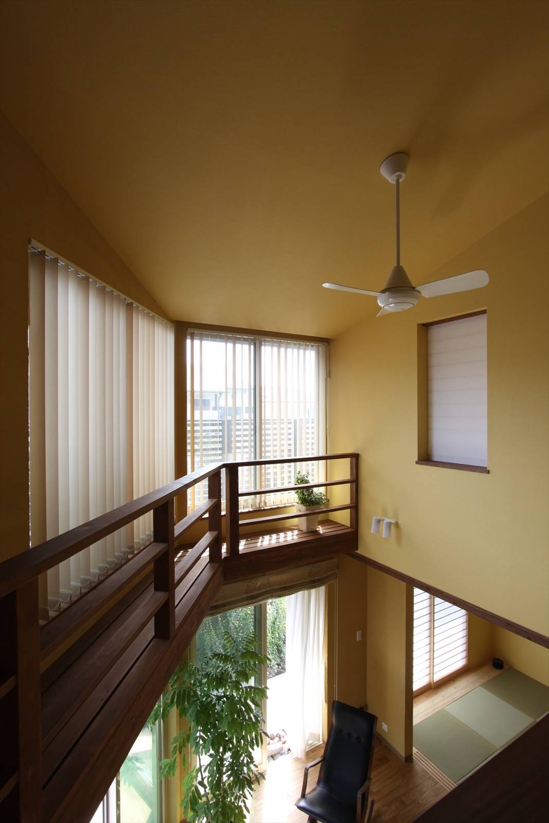 切断前の建物は緑に覆われた庭を囲むL字型の配置でしたが、将来の敷地分割を想定した今回の建替えでは南北2列の配置になりました。その結果オーナー住宅は南側隣地にこれまでに以上に近づいてしまうハンディーを抱えましたが、この問題を解消し室内に十分な採光を確保し、かつ南側の住宅との視線の交錯をなくし、さらに南東に広がる都立公園への眺望を得る方策として、建物の南東角を斜めにカットした台形平面として南側隣地から45度振れた南東面に大きな開口を設け、さらにその上部を吹き抜けにすることで、快適な採光・眺望環境を確保しました。