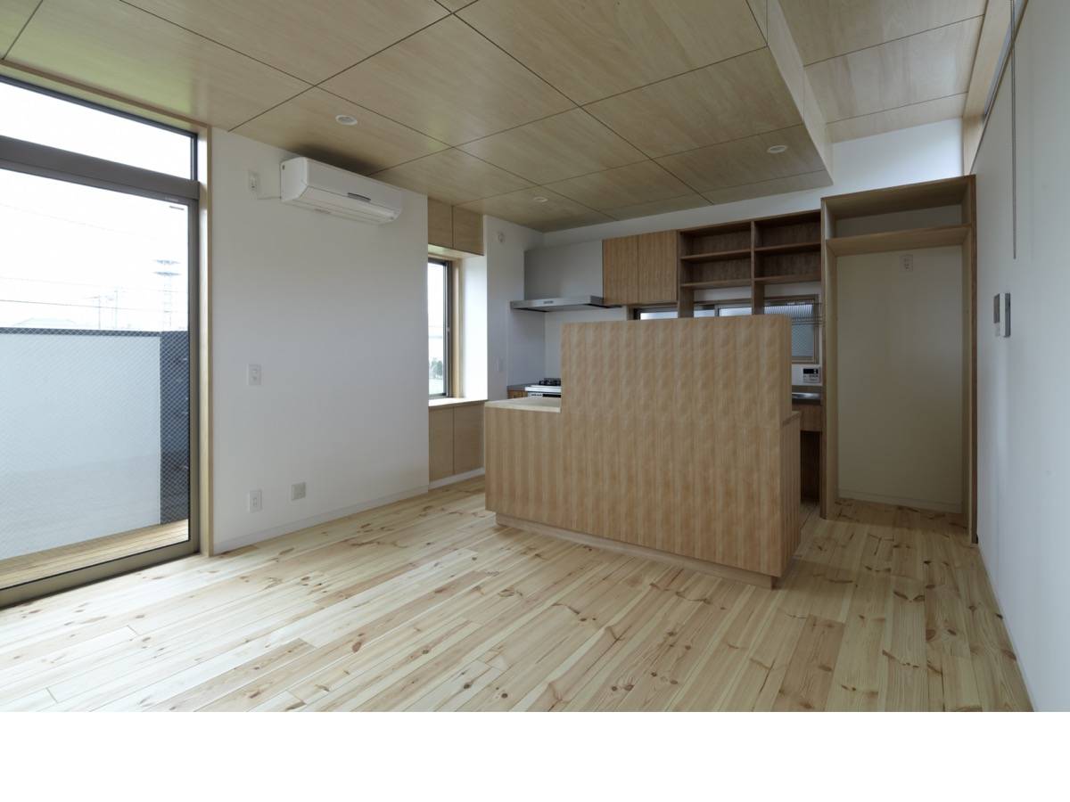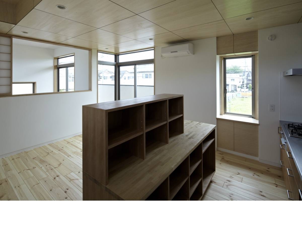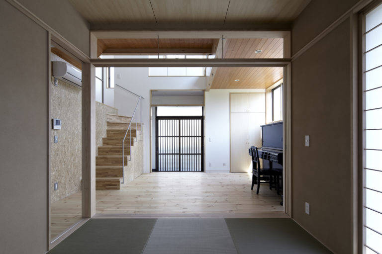 黒いシンプルな外観に対し、インテリアにおいては、モダンと和を融合させて、木や漆喰、パイン材やOSBなど、様々な素材を各所で組み合わせ、柔らかで多彩な雰囲気を創り出している。それにより、懐かしさと新しさが巧みに入り交じった、親密な気配の創出を心がけた。