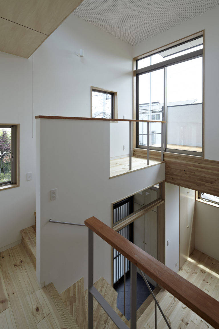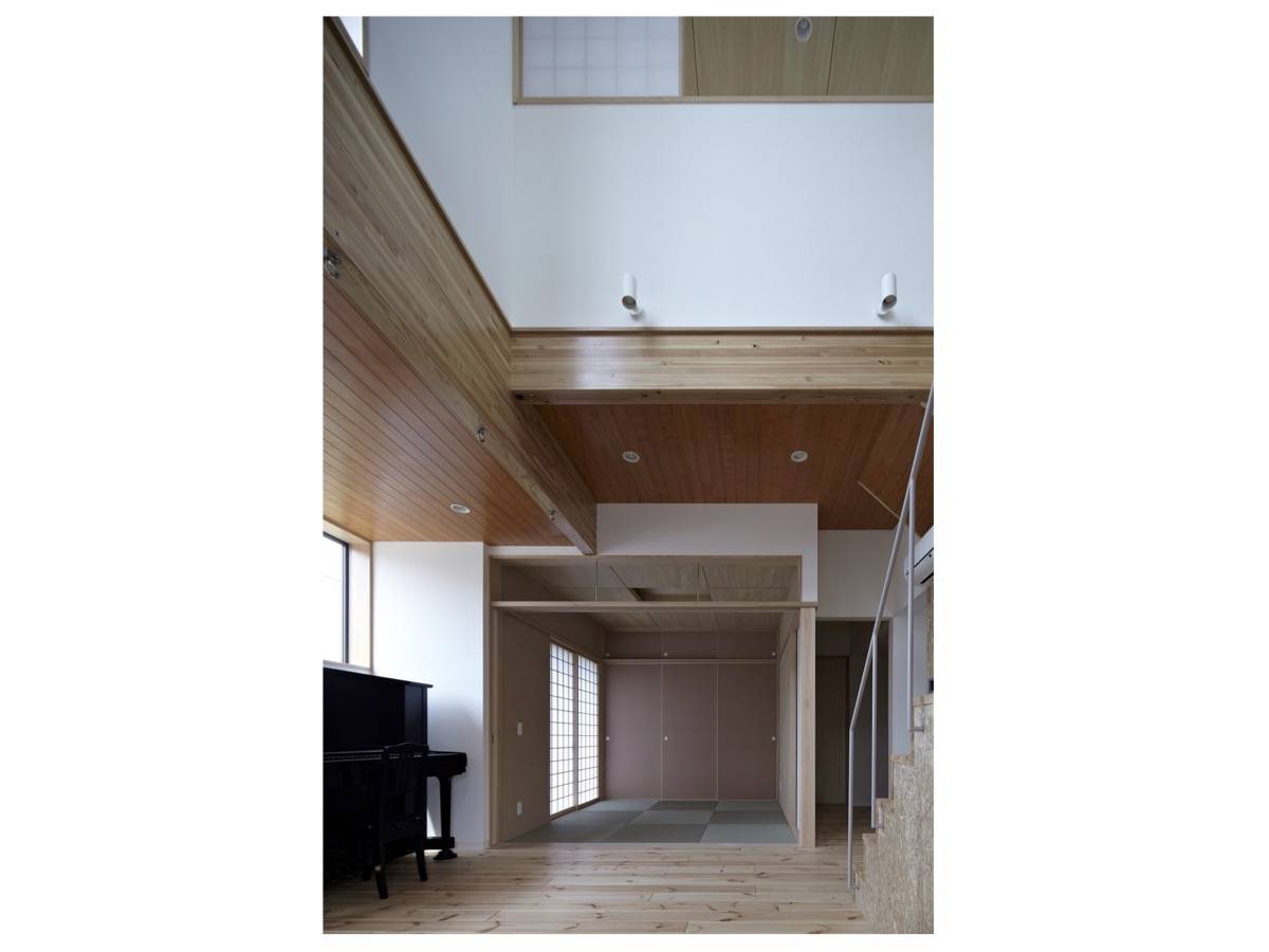 音楽教室のある住宅。螺旋状にめぐるスキップフロアを通して、中央の音楽ホールを取り囲むように、様々なレベルの床が計画されている。それにより、多様な人々の立体的な賑わいと、適切な残響時間を持った、豊かな音響効果が両立する空間を生み出した。