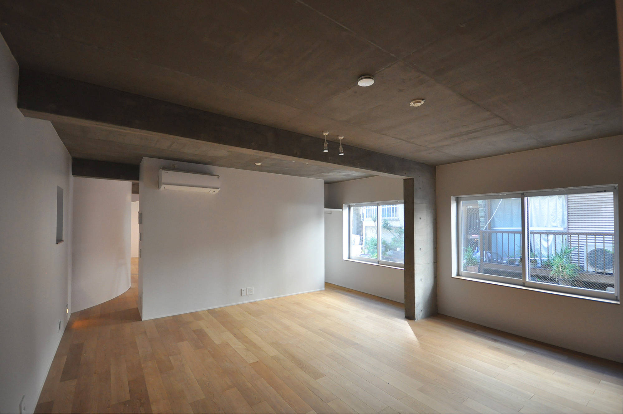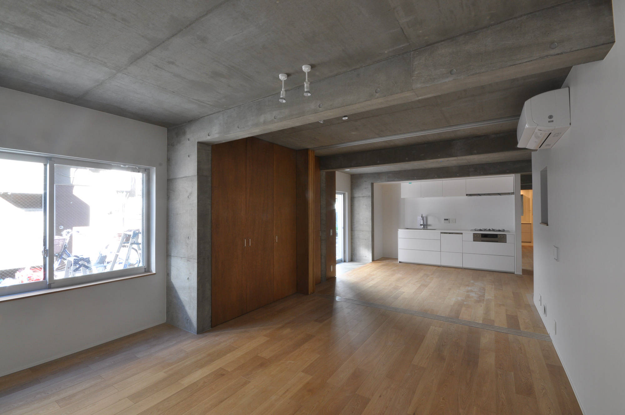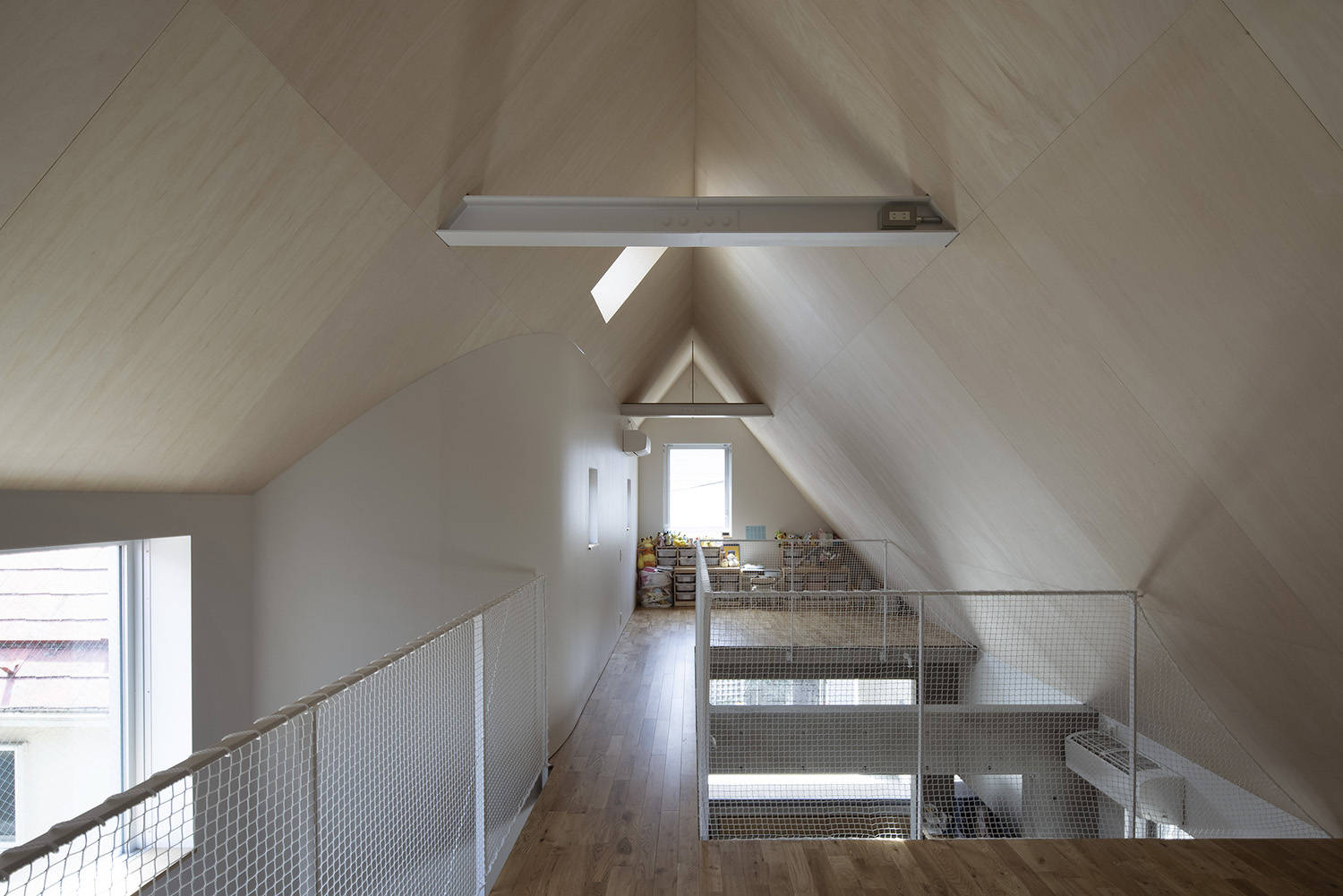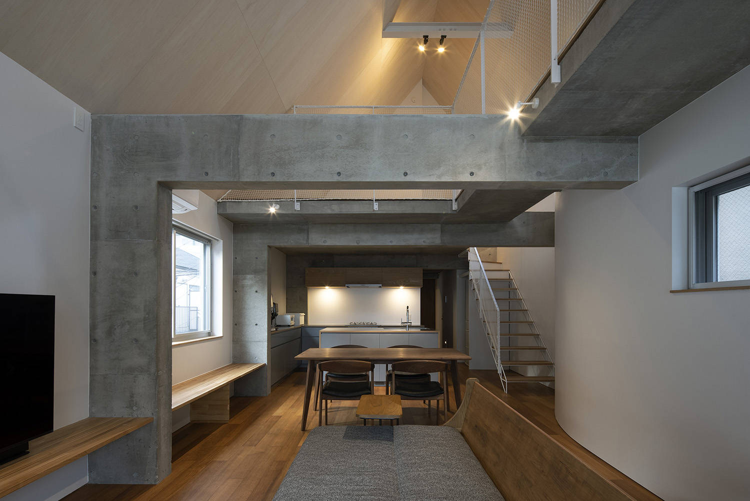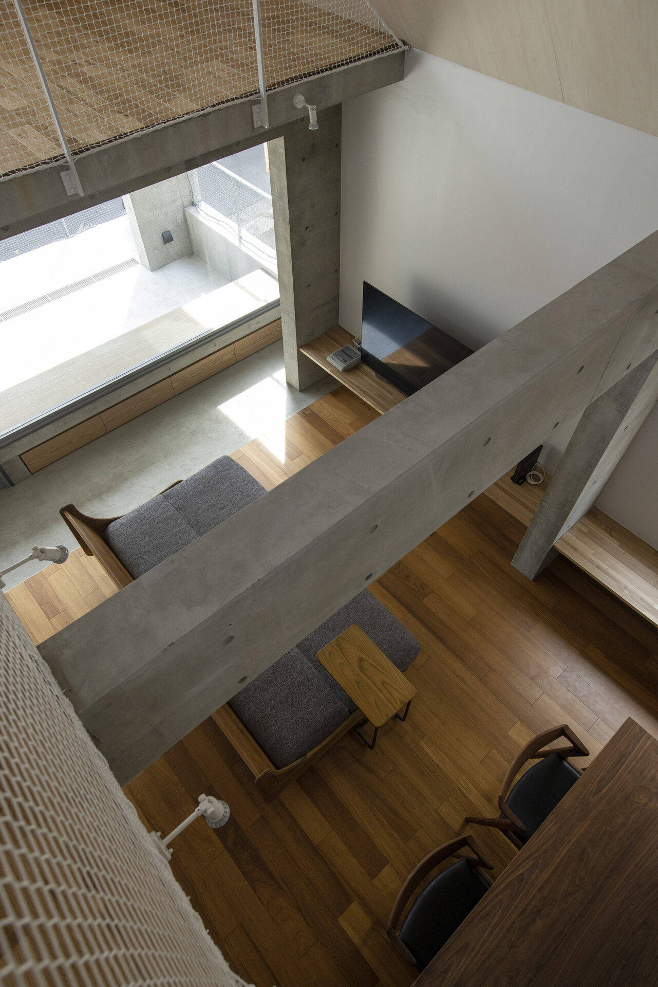 子世帯は、南側外階段から上がり、路地に開いたテラスアクセス型メゾネットとしました。路地の立体的延長として2階テラスが気軽に立ち寄れる場になると考えたのです。住戸内は門型フレームで緩やかに各場を作りながらエントランス、リビング、キッチンまでを連続した一体的空間としました。中央には吹抜けを設け、トップライトから光を落とすことで、採光確保と共に空間の広がりや中心性を持たせています。