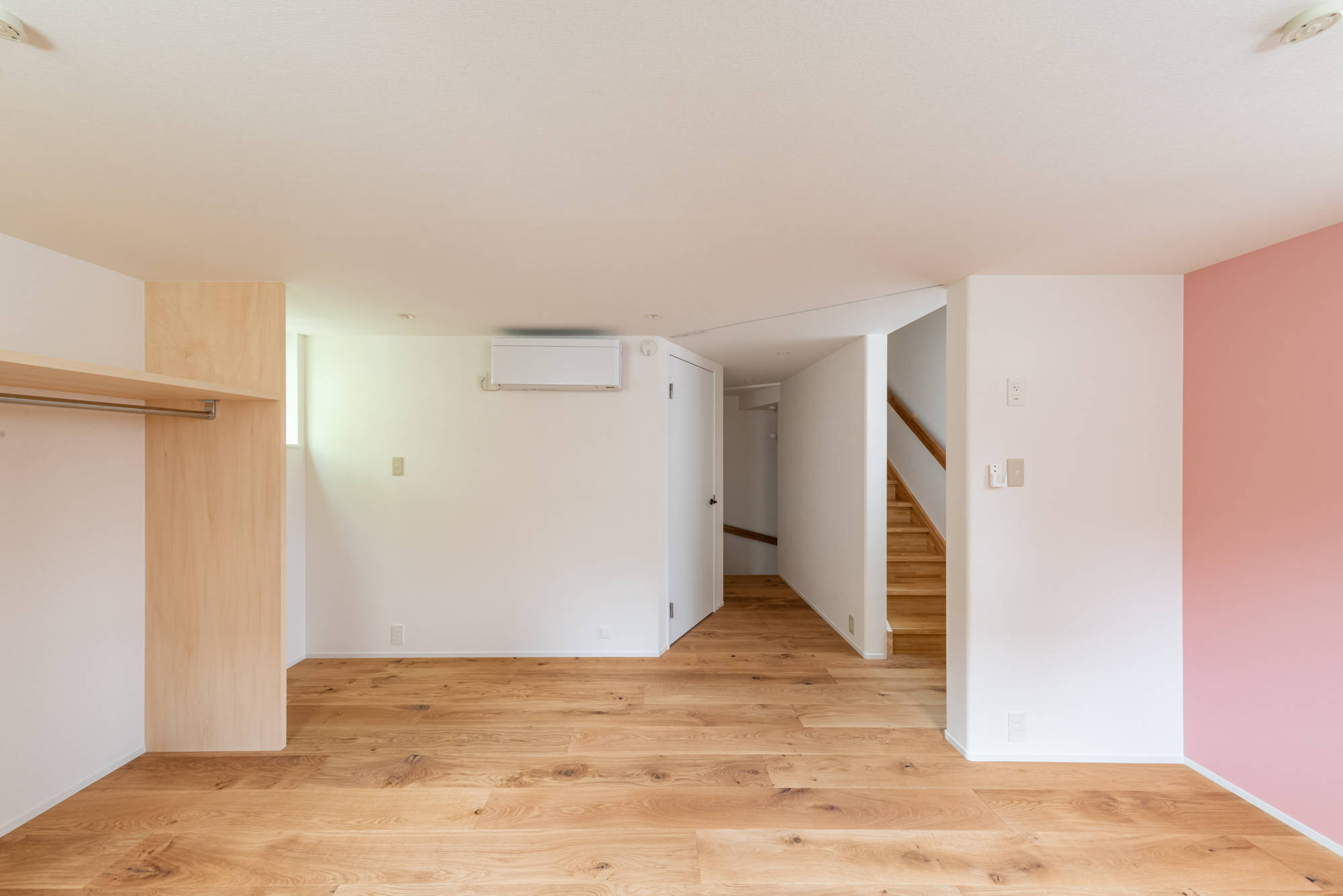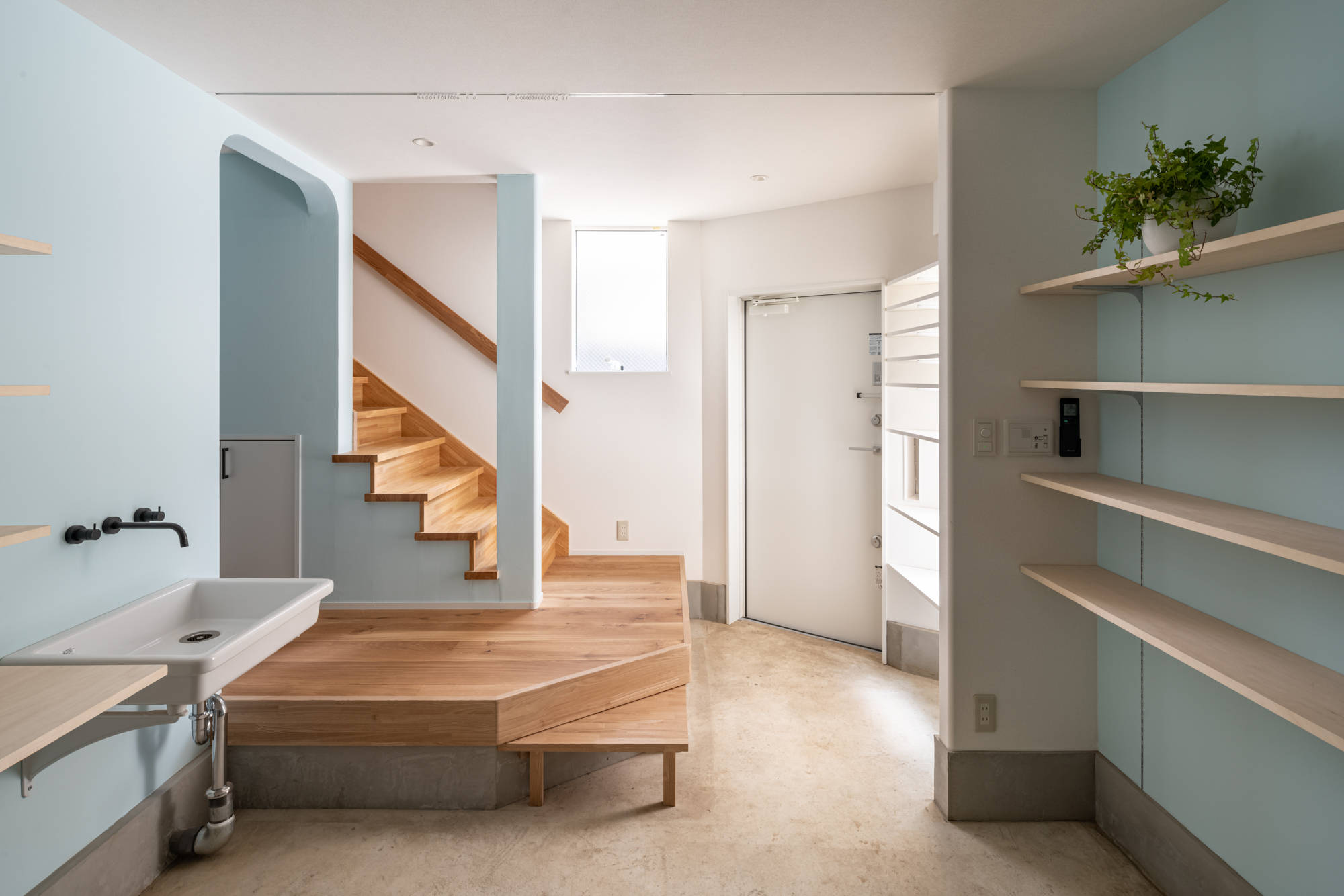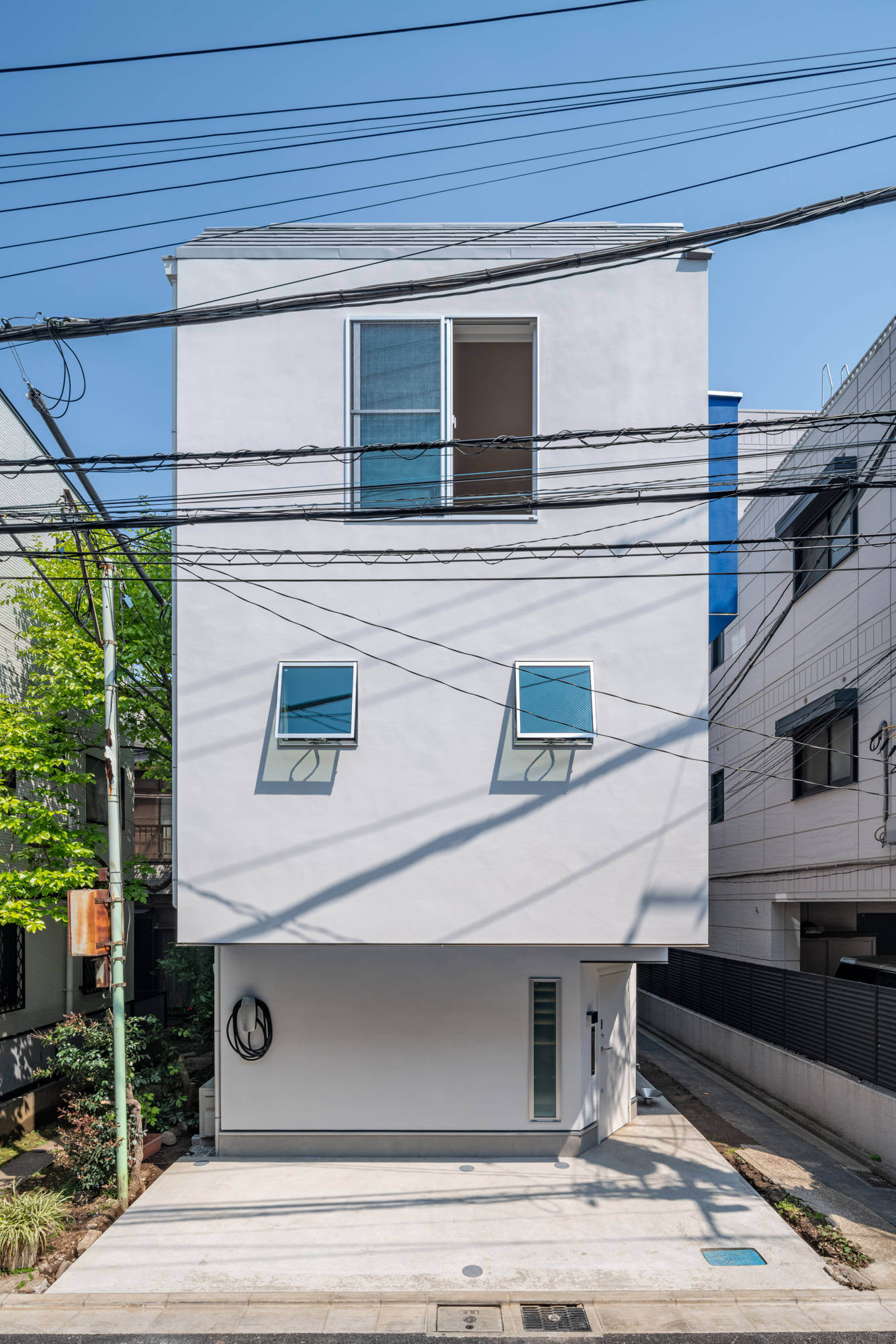 敷地は南側に接道しているいわゆる都心の狭小住宅密集地。前面道路の向かい側には4階建て、東側には3階建てマンションと建て込んでおり、1階への採光は1年を通して期待できません。そのため建蔽率最大の面積を確保したうえで、木造で法規的に可能な最大限の高さボリュームを確保し、皆が集まる場所としての「LDK」を採光・通風・パライバシー確保に有利な3階に配置しました。その3階は最大限の天井高を確保し、小屋裏収納としてロフト、大きな出窓を設置して極力広さを感じさせるような空間としました。その3階を生活中心として、共働き夫婦が効率よく家事が行えるように階段周辺にキッチン、水周りを配置した。1階は玄関と一体化した「土間スペース」を大きく確保し、各種収納や自転車やベビーカーを入れたり、TVマンであるクライアントの趣味部屋としても機能するよう自由な空間としました。将来的には工作教室、アトリエ、個室設置などに変更可能なよう建築的配慮は行っています。1階奥には家族共用のWICを設け、極力2.3階部分にモノが占める面積を減らして最大限活用できるように考えました。