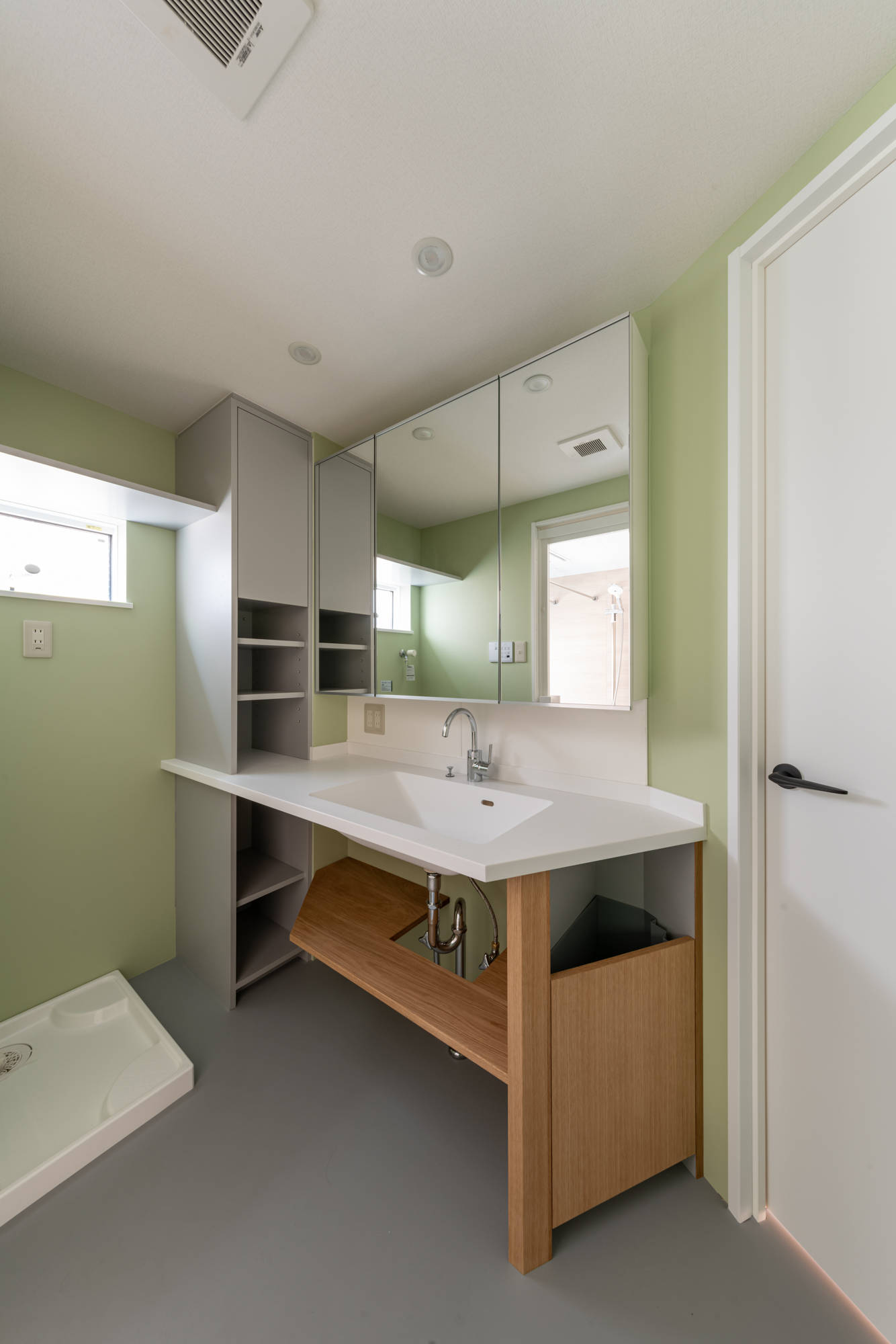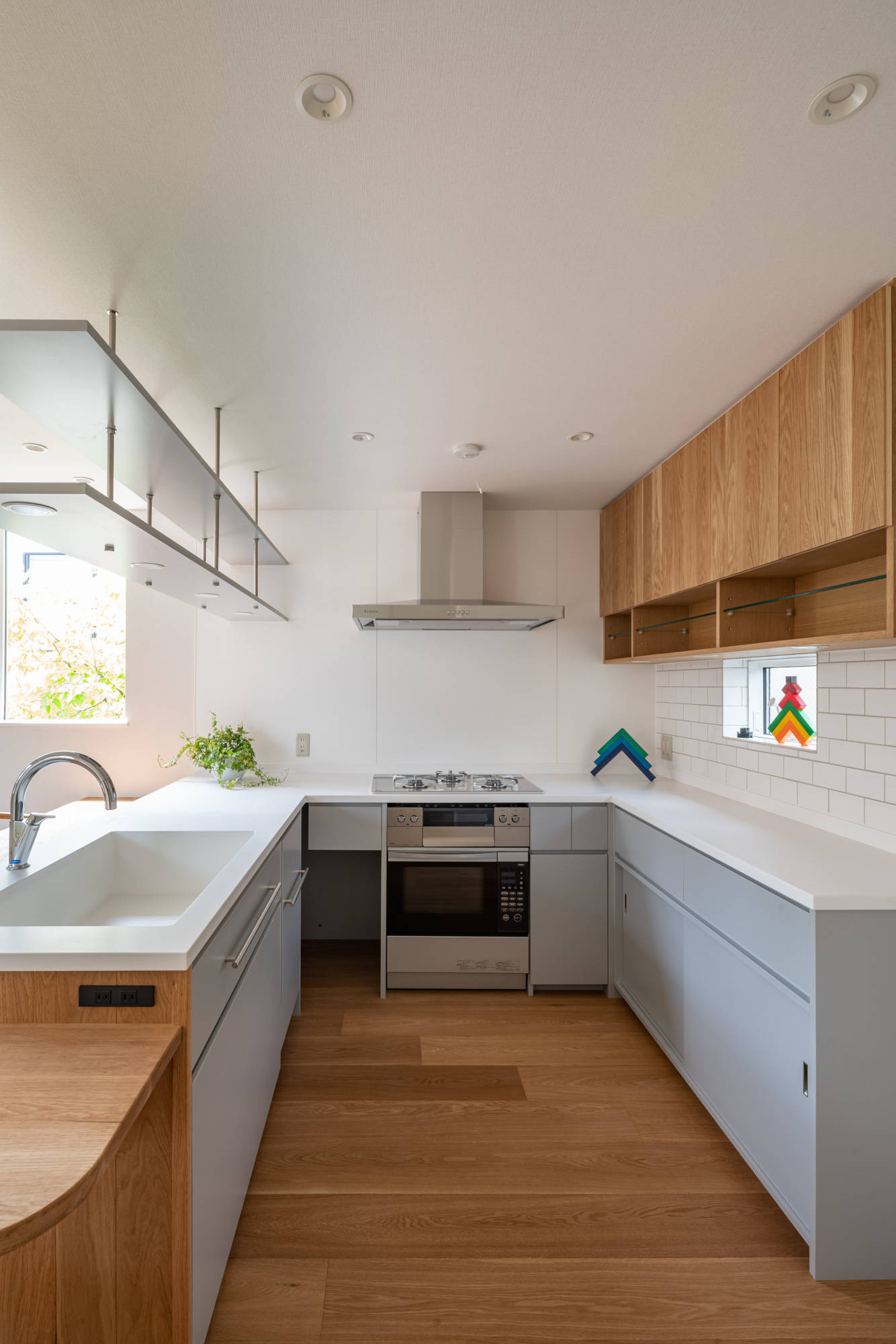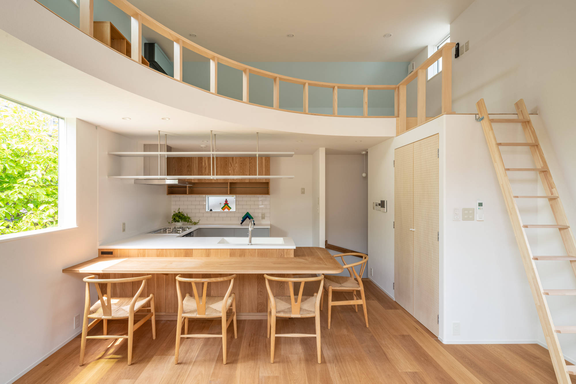 敷地は南側に接道しているいわゆる都心の狭小住宅密集地。前面道路の向かい側には4階建て、東側には3階建てマンションと建て込んでおり、1階への採光は1年を通して期待できません。そのため建蔽率最大の面積を確保したうえで、木造で法規的に可能な最大限の高さボリュームを確保し、皆が集まる場所としての「LDK」を採光・通風・パライバシー確保に有利な3階に配置しました。その3階は最大限の天井高を確保し、小屋裏収納としてロフト、大きな出窓を設置して極力広さを感じさせるような空間としました。その3階を生活中心として、共働き夫婦が効率よく家事が行えるように階段周辺にキッチン、水周りを配置した。1階は玄関と一体化した「土間スペース」を大きく確保し、各種収納や自転車やベビーカーを入れたり、TVマンであるクライアントの趣味部屋としても機能するよう自由な空間としました。将来的には工作教室、アトリエ、個室設置などに変更可能なよう建築的配慮は行っています。1階奥には家族共用のWICを設け、極力2.3階部分にモノが占める面積を減らして最大限活用できるように考えました。