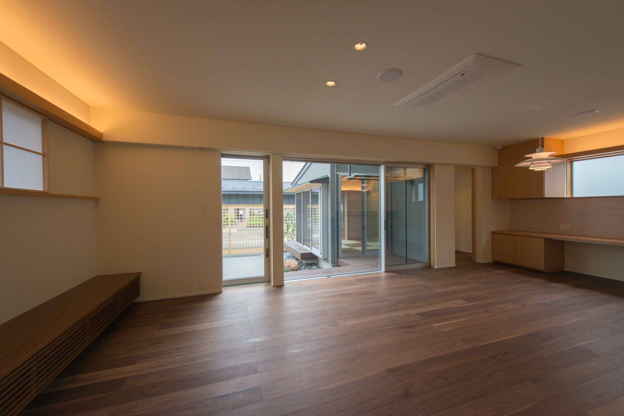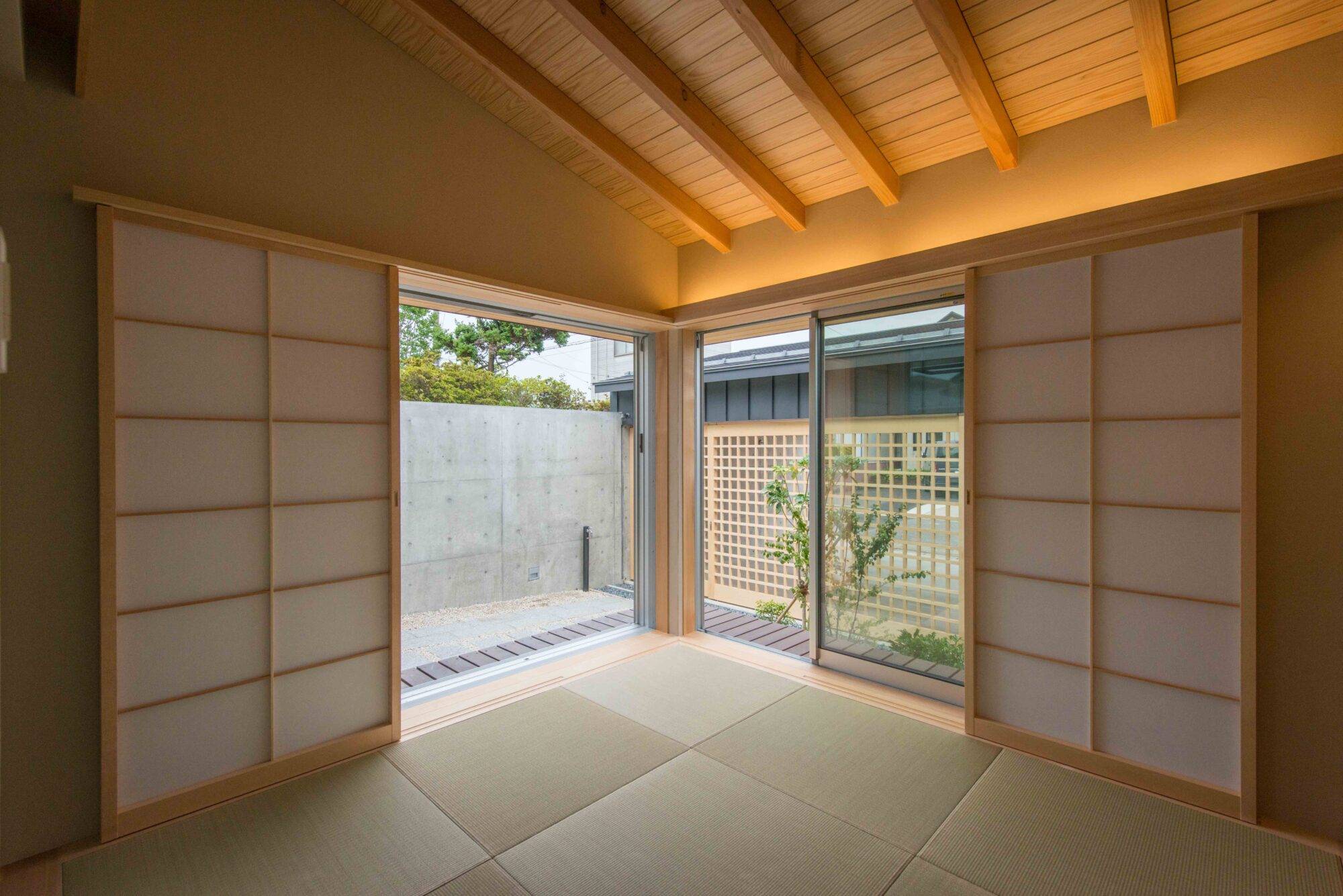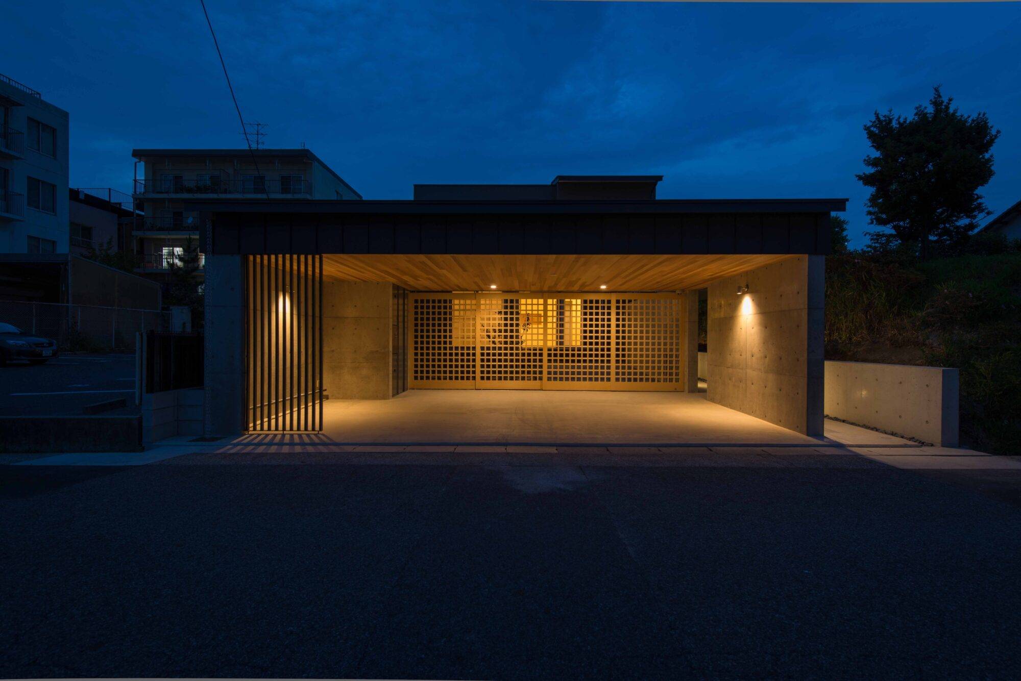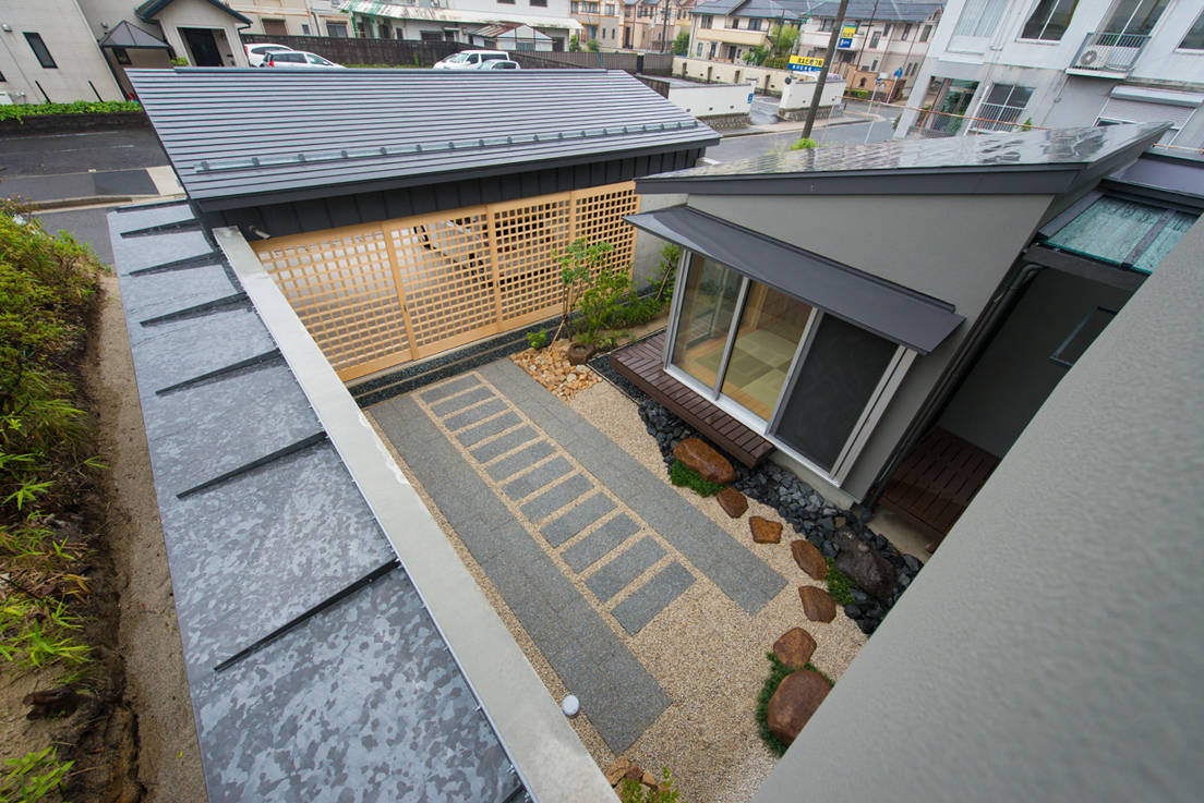 名東区の閑静な住宅地にある敷地は東西間口10m、奥行き24mの細長い形状でした。駐車場と庭を確保しつつ採光を得る為に住宅部を北側に、屋根付き駐車場を南側に、その間に庭という配置計画にしました。そうすることで生まれる道路から住宅までの細長いアプローチ以外を塀で囲い込み、隣地の月極駐車場からプライバシーを確保しています。塀は強固なものだけではなく、風が抜け、適度な距離感が保てる格子引戸も使用しています。