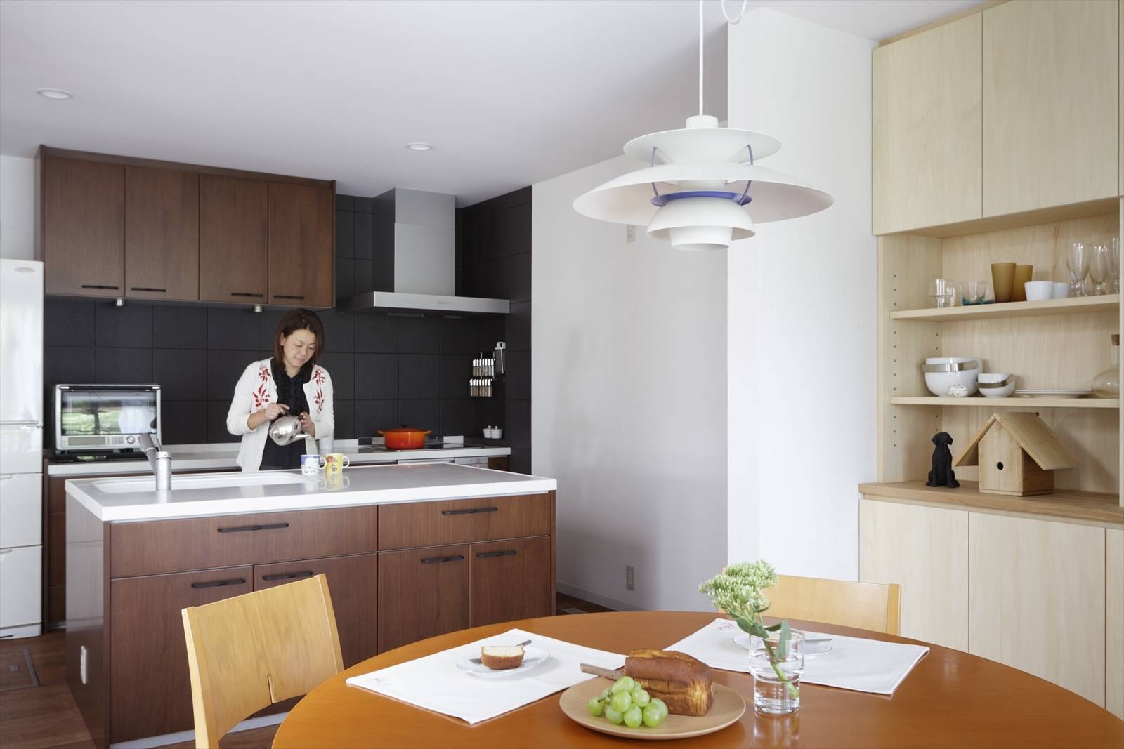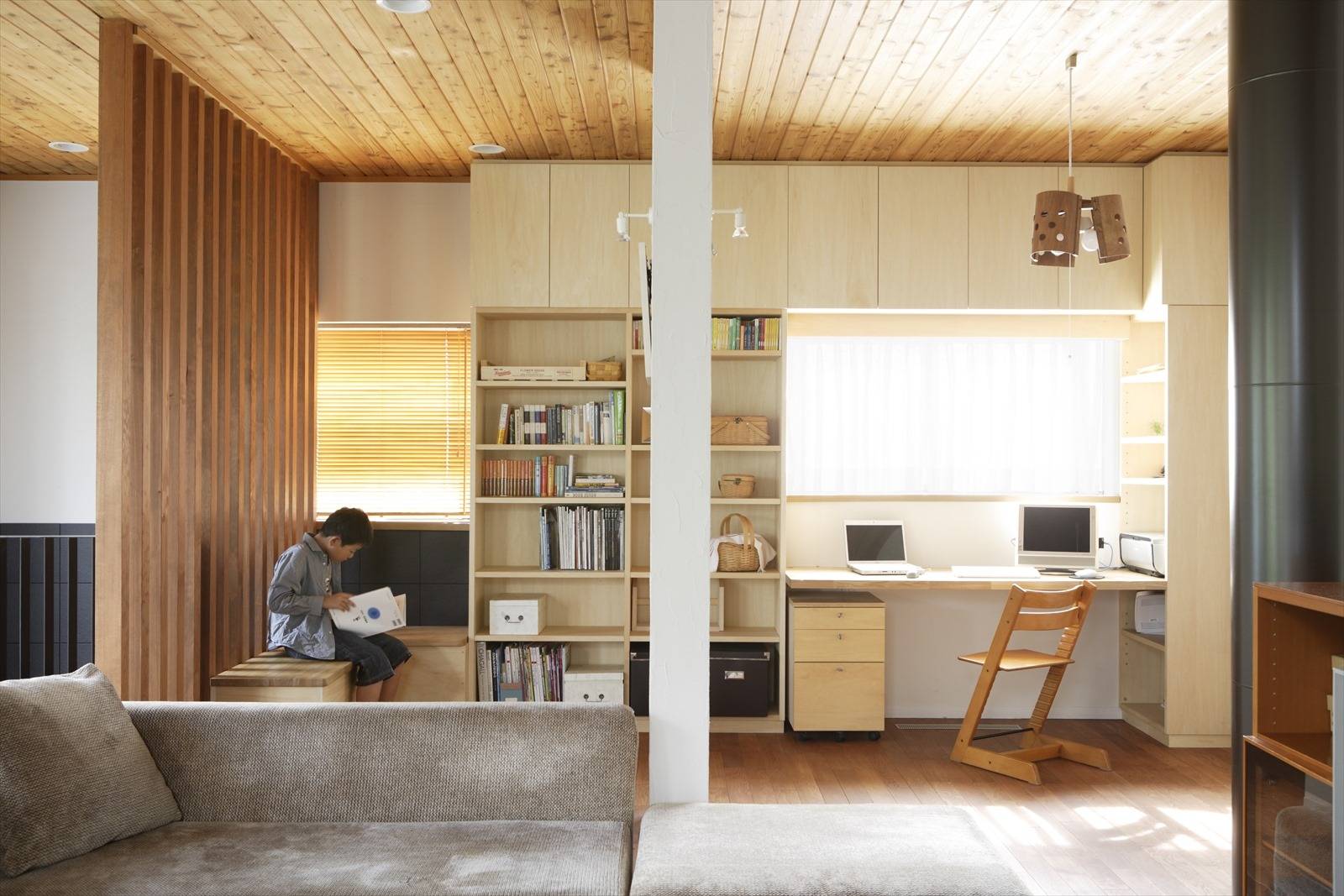 LDKの一角にはワークデスク/本棚/ベンチが一体となった造作家具を設け、家族が思い思いの活動をしつつもこの部屋に集まっていられるようにしました。また寒い廊下で隔てられれていた浴室/トイレをリビングダイニングに直結することによりヒートショックを低減しました。 部屋の一隅には大切な家族であるチャロ(犬)のゲージがあり、室内とテラスを行き来できるようになっています。愛犬仲間の集まりに便利なリードフックを各所に設けるなどの工夫もなされています。