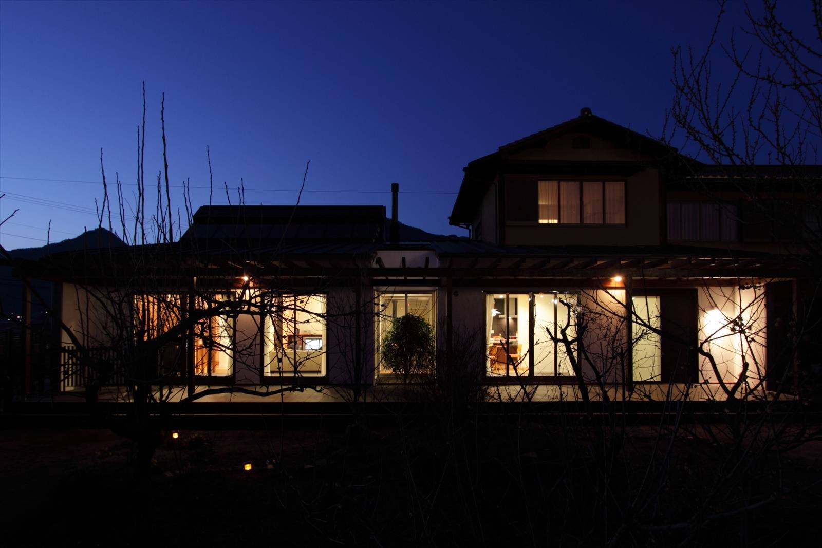 母屋と離れに分かれていた大きな2世帯住宅を一体化し広いリビングダイニングを設けました。また使われていなかった2階を主寝室や子供部屋に再生し、格式のある1階の座敷や広縁などはそのままの状態を残しました。リビングダイニングは小さな中庭や新たに補強した耐震壁などによって広い空間をいくつかのコーナーに分節することで落ち着いた心地よいスケール感の空間となっています。