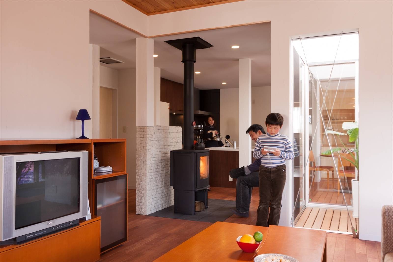 屋根面で集熱した太陽熱を床下経由で室内に循環させるOMソーラーシステムや南面した広い土間テラスでの太陽熱のダイレクトゲインなどのエコロジカルな仕掛けを導入し、冬は薪ストーブ+エコシステムによって石油ヒーターやエアコンを使わない生活を目指しています。また夏は中庭を活用した通風経路の工夫や断熱材の補強によりエアコンを使わない予定です。