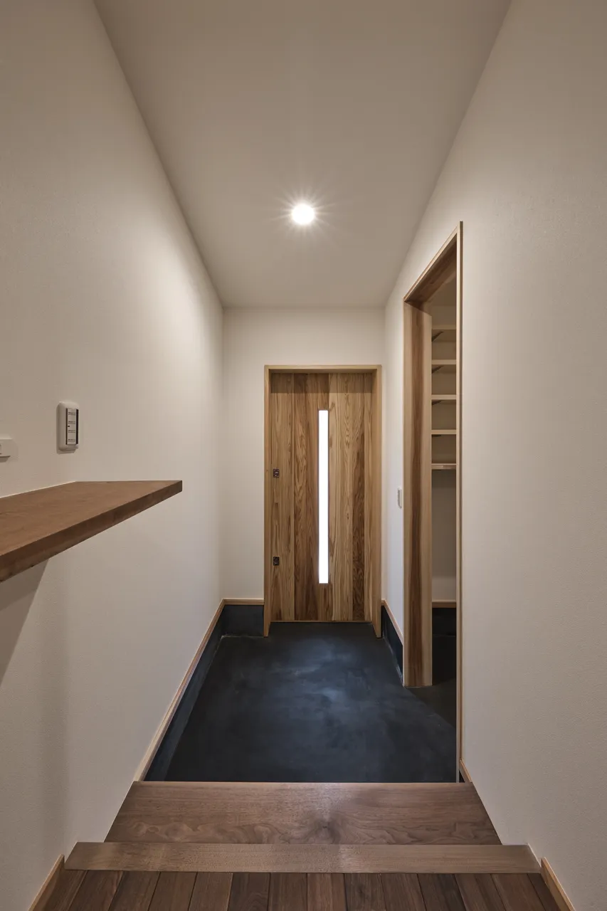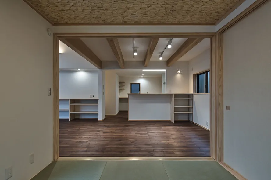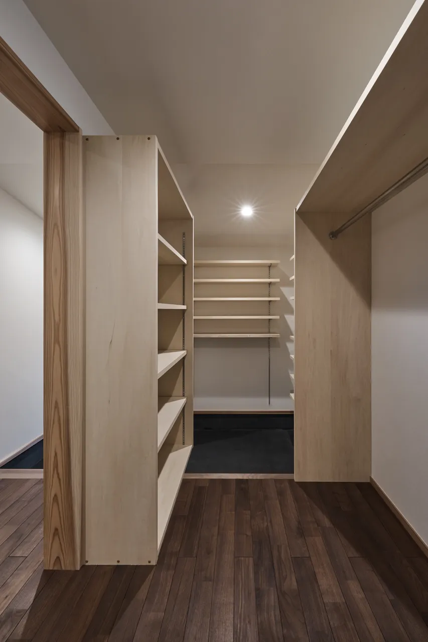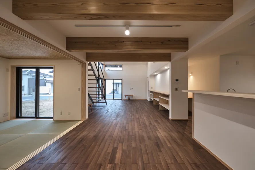 京都右京区に位置する、木造二階建ての新築工事。近くには観光で有名な嵐山の竹林や渡月橋など、京都を代表する観光スポットが多くあるこの地に、区画整理された新品の敷地が今回の計画地。遠くには嵐山が望める環境であることから、雁行した平面プランにより内部の流動性を高めつつ、その手法で出来た空間の溜まりに、各室の広さや天井高さによって外部を取り入れる窓を調整することによって、人が佇める空間を計画しました。