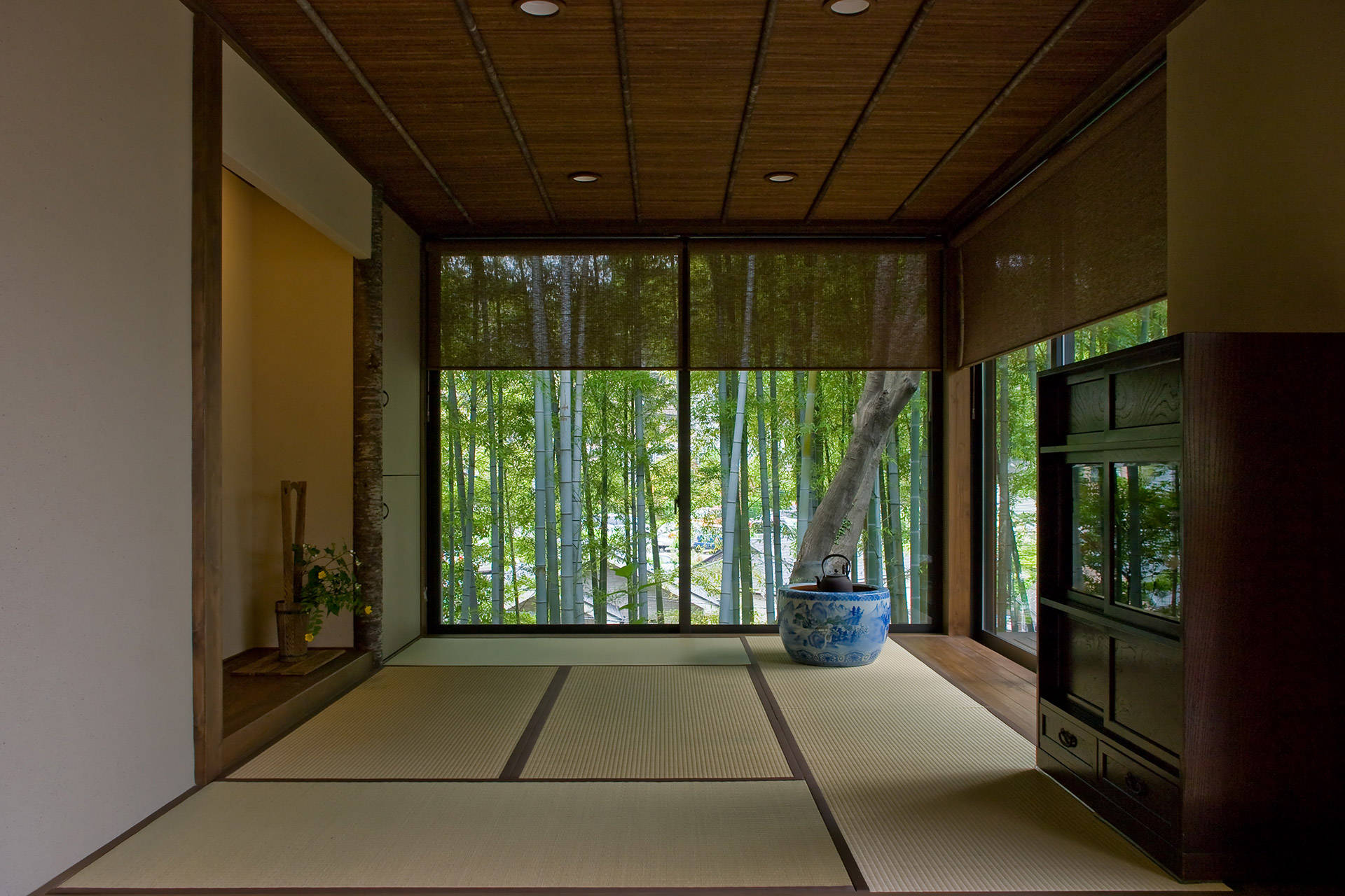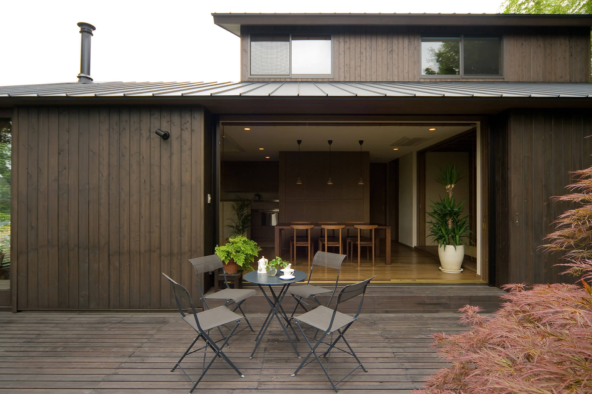 両親が丹精込めて造り上げてきた庭を壊さず緑豊かな廻りの風景になじむ落ち着いた外観。