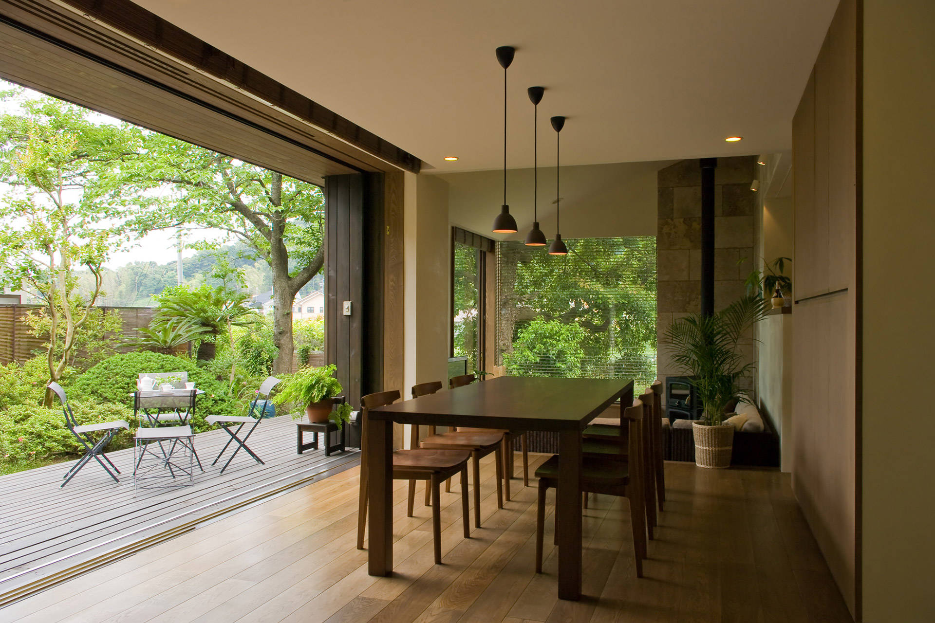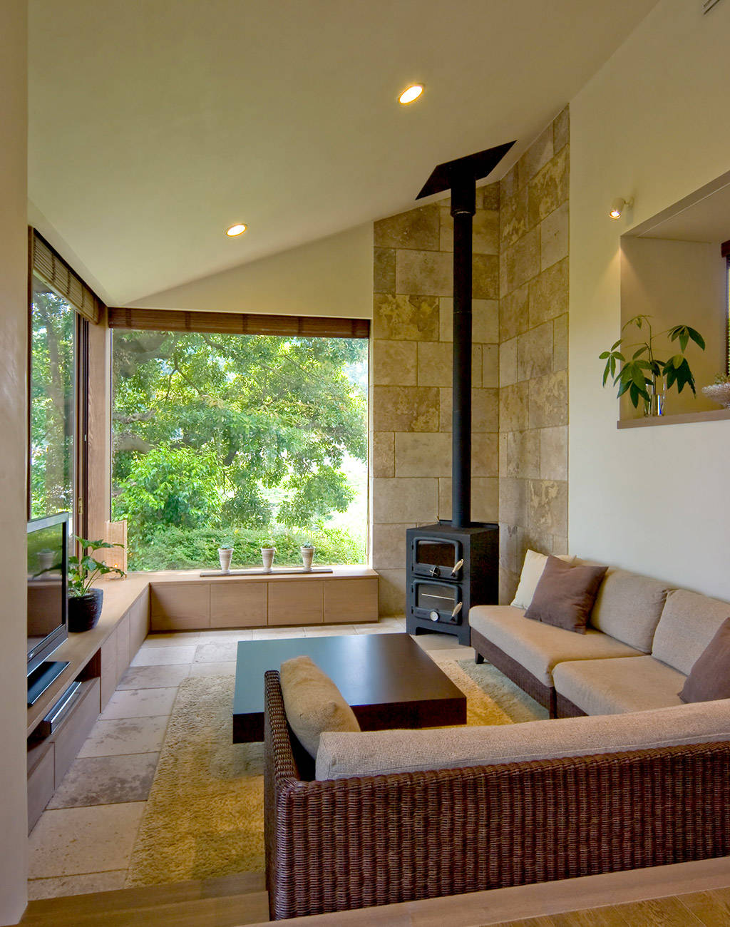 大きな窓から外の景色を大胆に取り込み、家の中に居ながらも自然の中に身を置いているような気持ちの良い空間となりました。 ヒノキ、漆喰、石、無垢のフローリングと自然素材にこだわりました。夏は窓を全開にして気持ちのよい風を取り組み、冬は居間に設置した薪ストーブのやわらかな暖かさで一日中快適な家となりました。