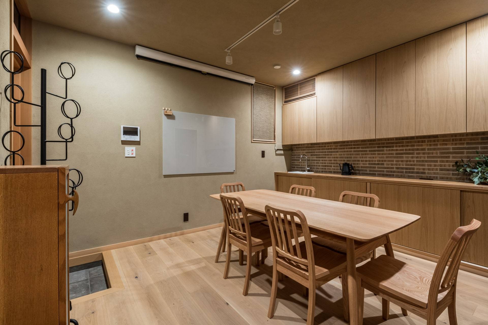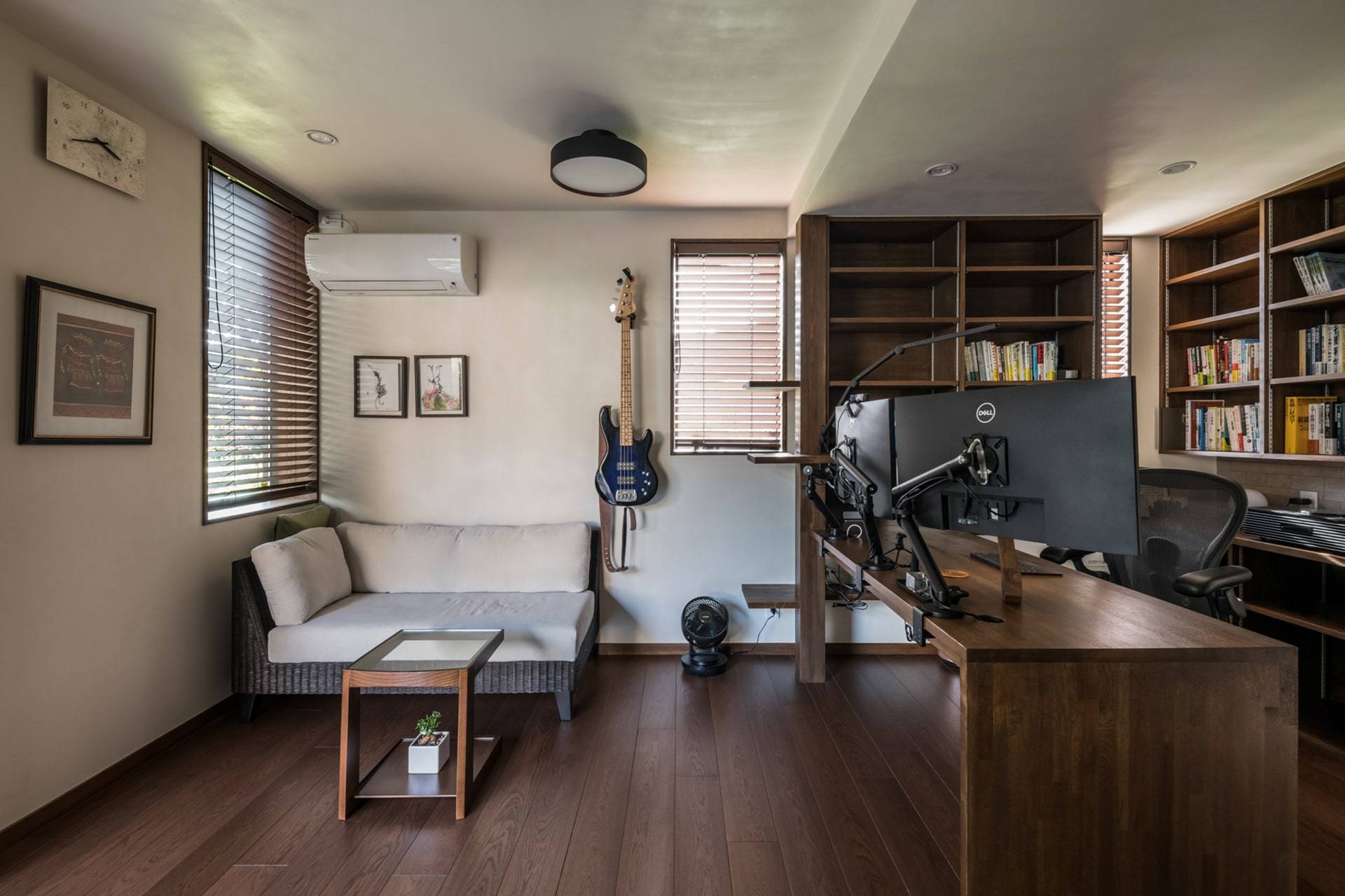 リビングの先にはご主人と奥様の書斎がそれぞれあります。書斎は仕事や趣味の音楽などを楽しめる空間としました。書斎から庭に出てウッドデッキを渡ると離れのワークスペースにアクセスします。こちらはお客様との打合せ、セミナーや会議室としても使用できます。離れになっている事で住空間と程よい距離感を持たせることが出来、お客様をお迎えしやすいワークスペースとなりました。