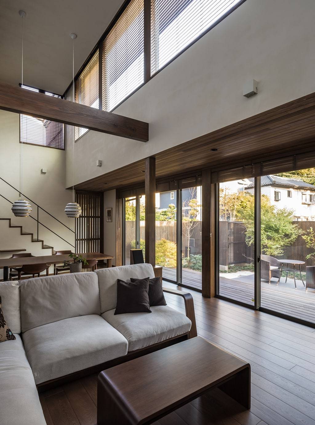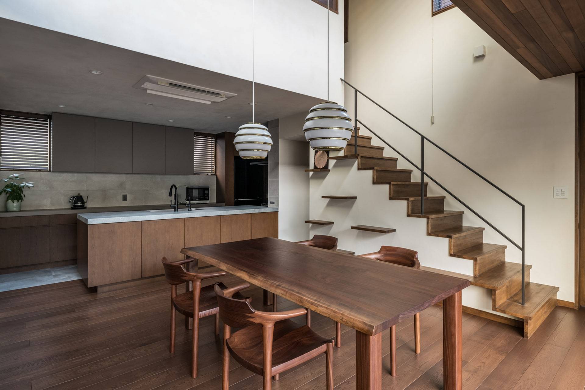 1階のリビング、ダイニングは吹き抜け空間となっています。掃き出し窓は庭との一体感を強め、高窓からは光を奥深く取り込みます。軒の深さが四季に応じた日差しの量をコントロールしてくれます。