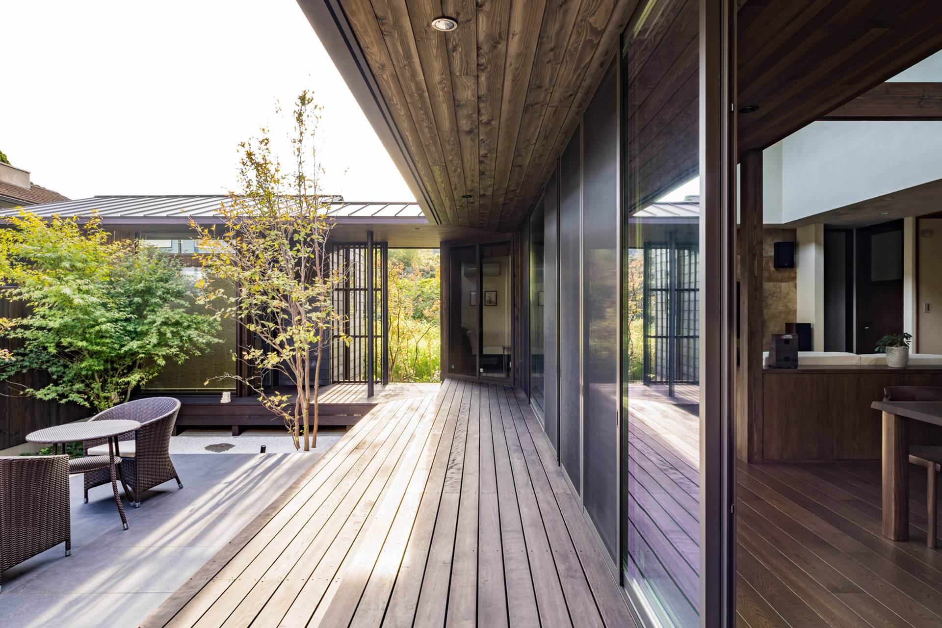 母屋と離れのワークスペースで庭を囲い、どちらからも庭を楽しめるような配置計画にしました。このお庭はさらに杉板塀で囲い、コートハウス風のプライベート感も持たせています。