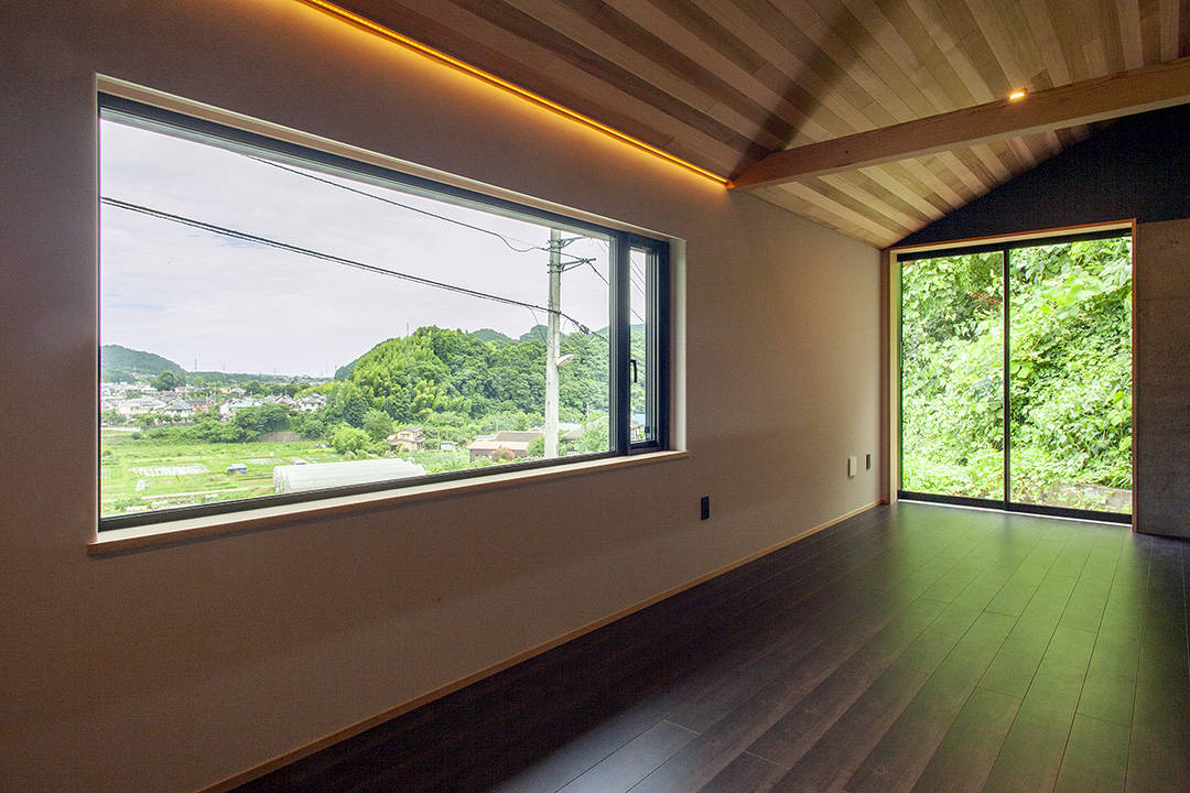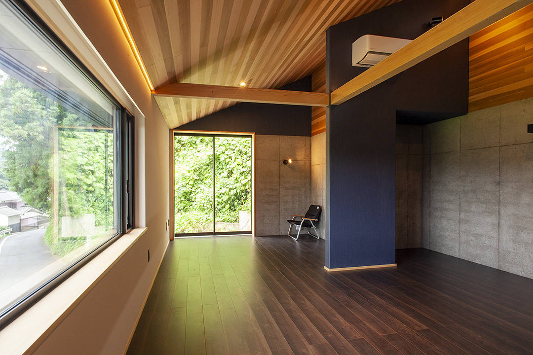 崖と道路に挟まれた南北に細長い敷地に建つ、20坪ほどの平屋建て、単身者のための家で、最初は別荘として使用して、その後移住する予定です。厳しい敷地条件と、施主の要望により他には同じものはないと言える家です。