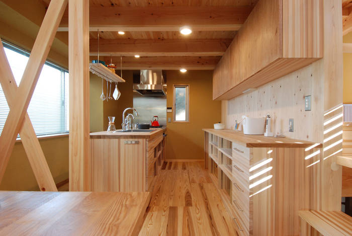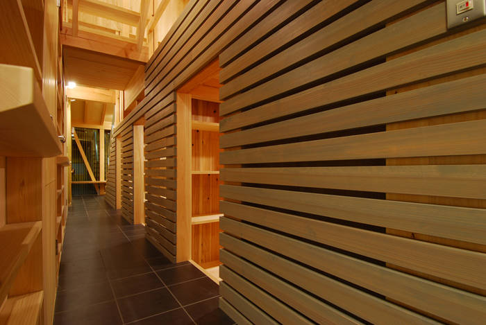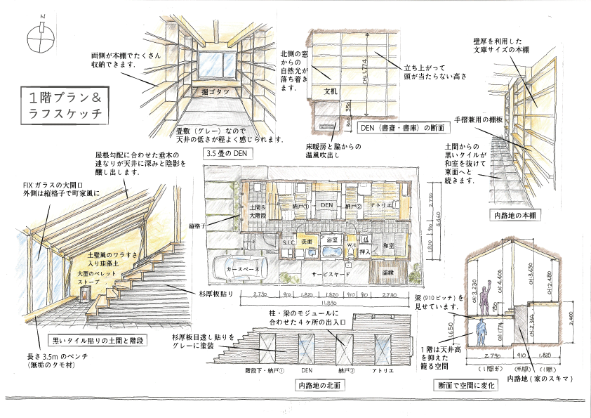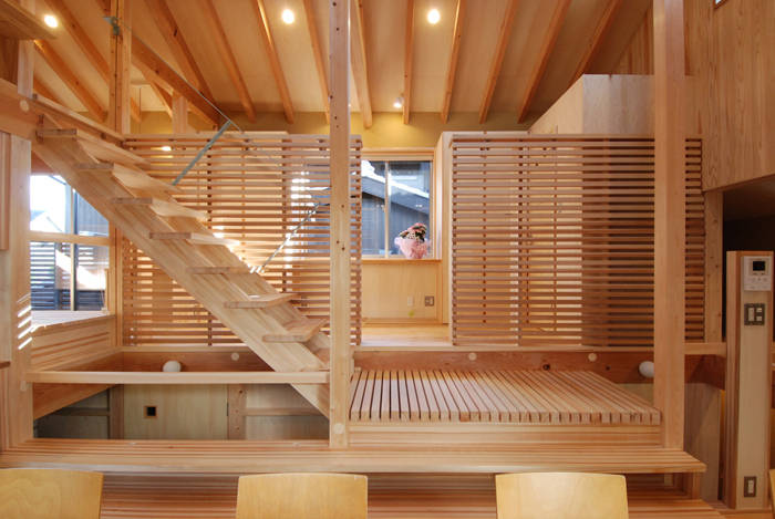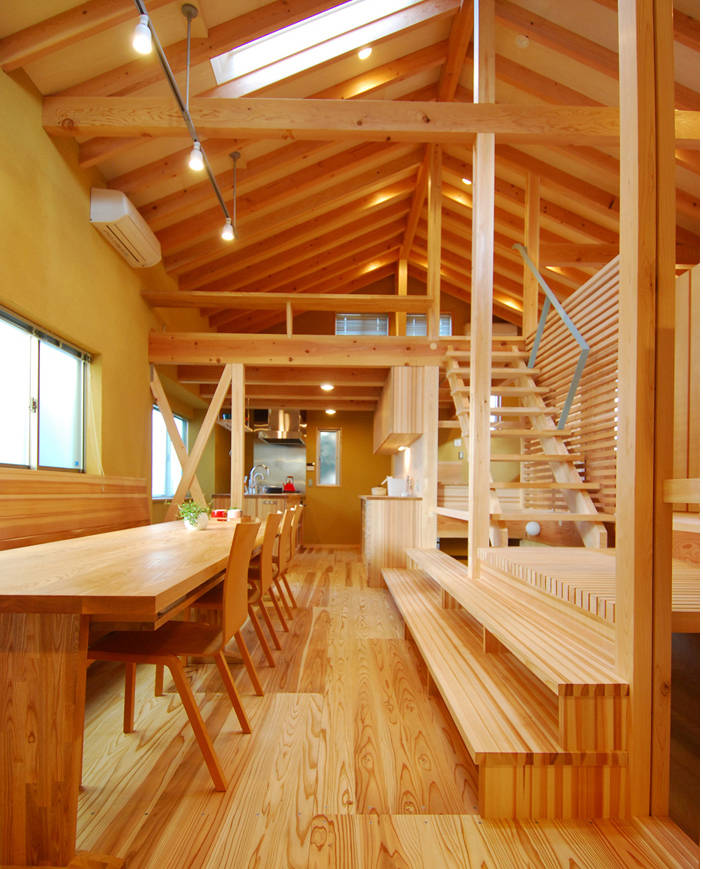 在来の木軸構造を出来るだけ表し、間仕切や建具も最小限にとどめた「素のまま」の家を表現しました。玄関を入ってすぐの大階段は丘を上がるような気分にさせ、階段下は洞窟のような暗がりにこもる感覚をと、ぎりぎりの高さにし、収納、書庫、アトリエ等にしています。空間の「高低」のメリハリを付けることで、家の中に「明」と「暗」をつくりました。南・北のゾーンの中間は東西を貫く街の「内路地」のようになっています。 家全体が緩やかにつながり、「回遊できる空間」、日本家屋のように部屋の用途を限定しない彷徨える家としました。