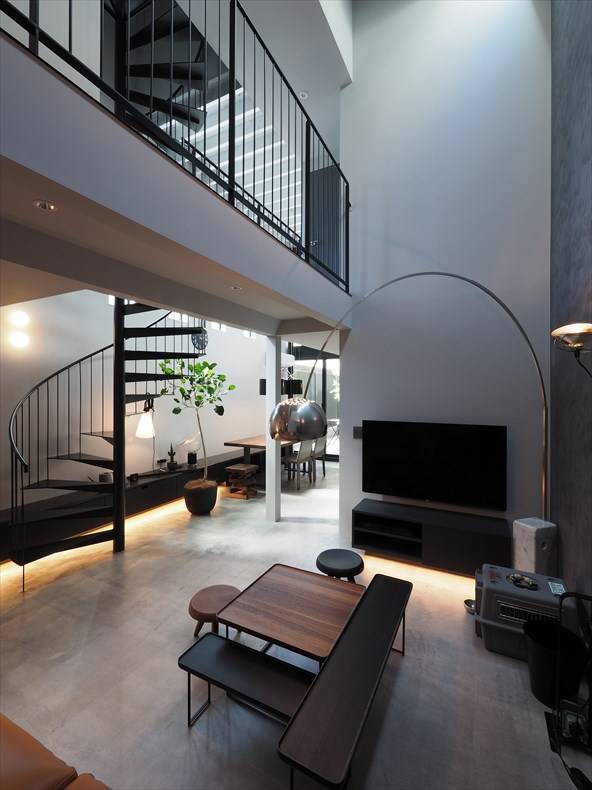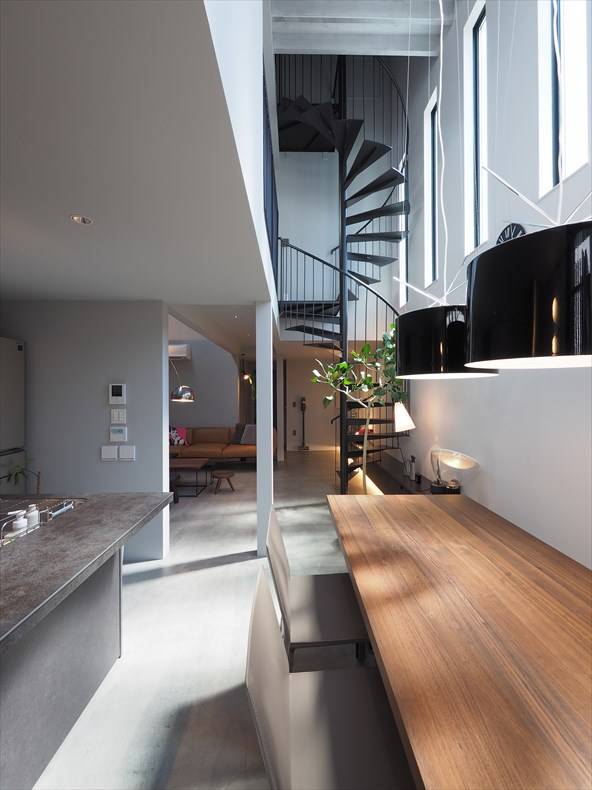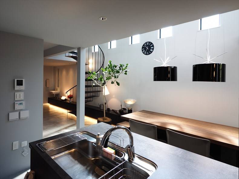 1階のリビングダイニングキッチンは大きなワンルームですが、二つの吹き抜けにより、変化に富んだダイナミックな空間となっています。また、建て込んだ周辺環境を考慮して、採光はトップライトや吹抜け上部のハイサイドライトなどを活用し、陰影に富んだ表情を持たせています。