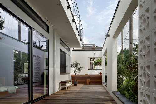 日当たりの良さを生かしながらプライバシーを確保するため、壁に囲まれたテラスを設けた。