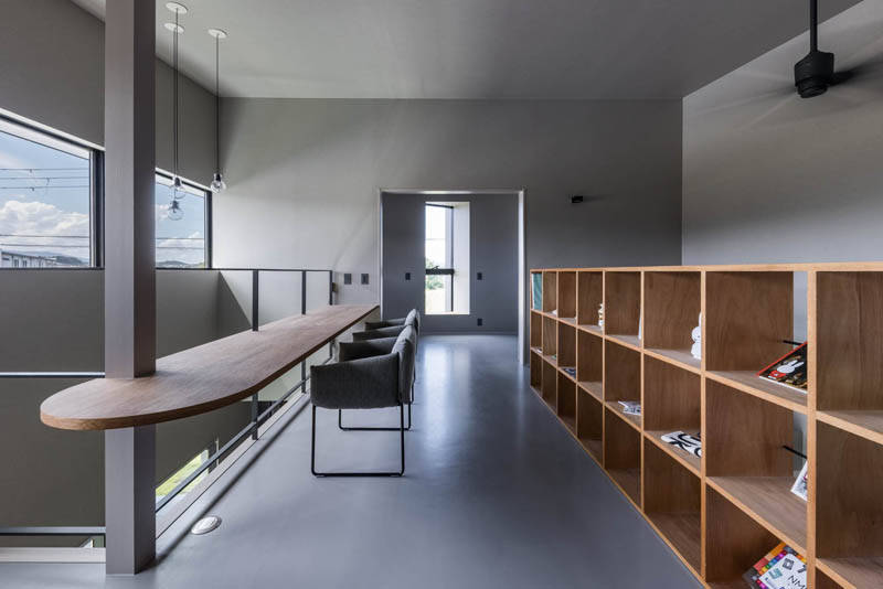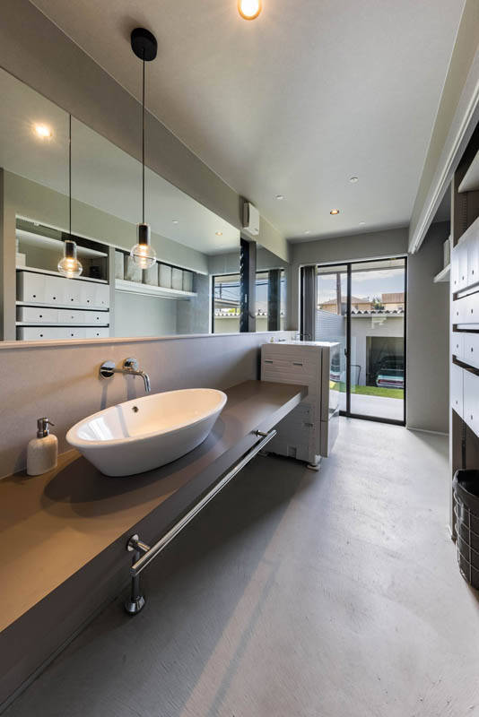 通りから導かれる小さな路地がほぼ建物中央に貫通し、東側に母スペース、西側に自分たちのエントランスと水廻りが配され、家の中の路地に互いが向かい合い適度な距離感を持つ2世帯生活空間の設えがなされています。