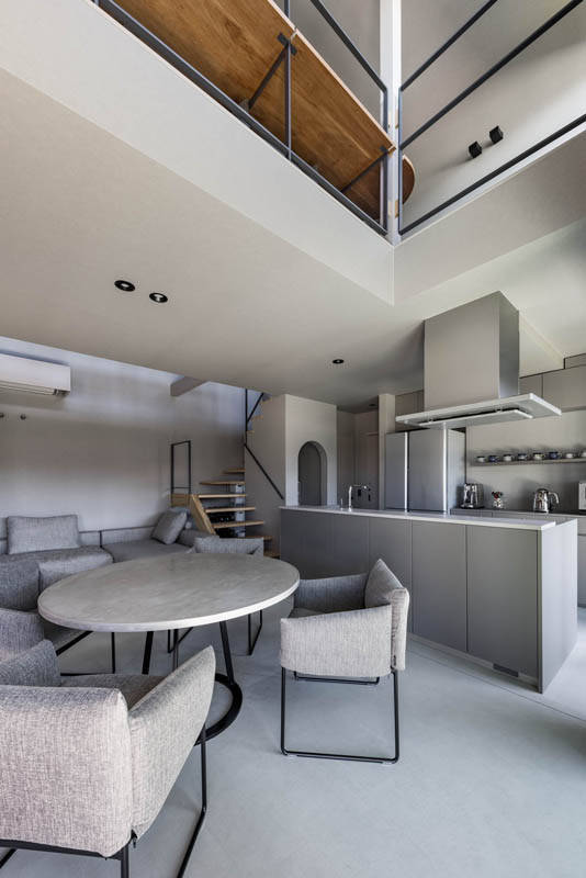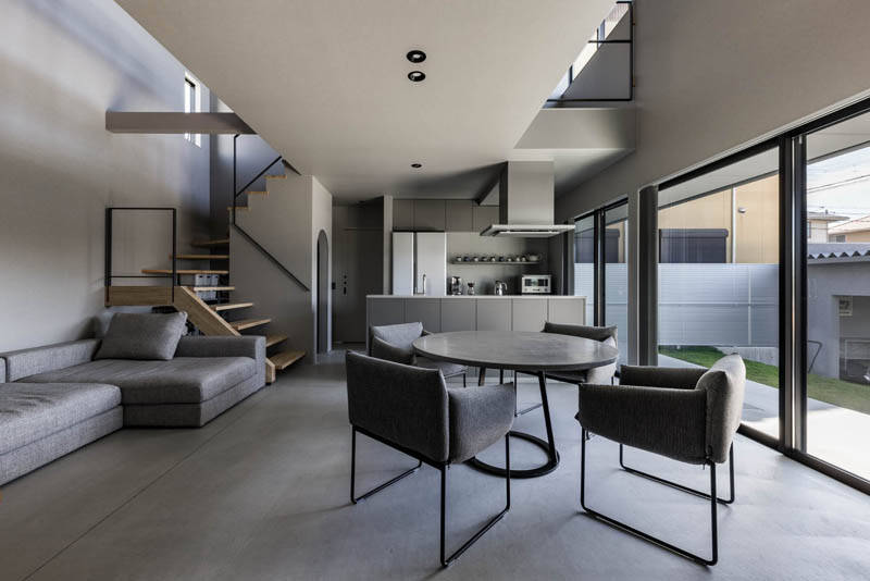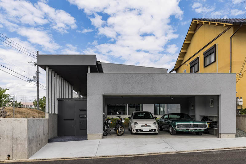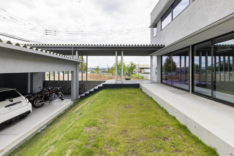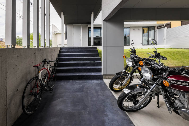 その路地に面してバイクガレージがあり、さらに吹抜けで繋がる2階LDKへと空間が展開されています。