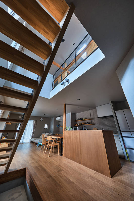 多くの検討案の中から導き出されたワンルーム空間は道路からのノイズをクリアするためにエントランス収納や水回りでカバーしながら吹抜を持つ土間空間に階段が架けられてました。