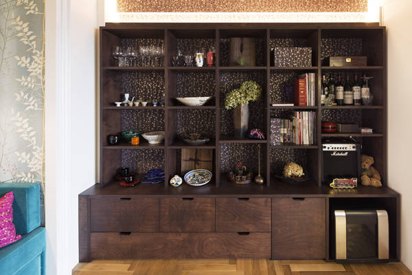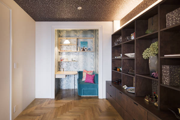 とあるマンションの一角。 4畳半の畳の部屋を趣味で彩った住まい手らしいお部屋に変身させました。 押し入れだった場所は爽やかな水色の読書コーナーへ。