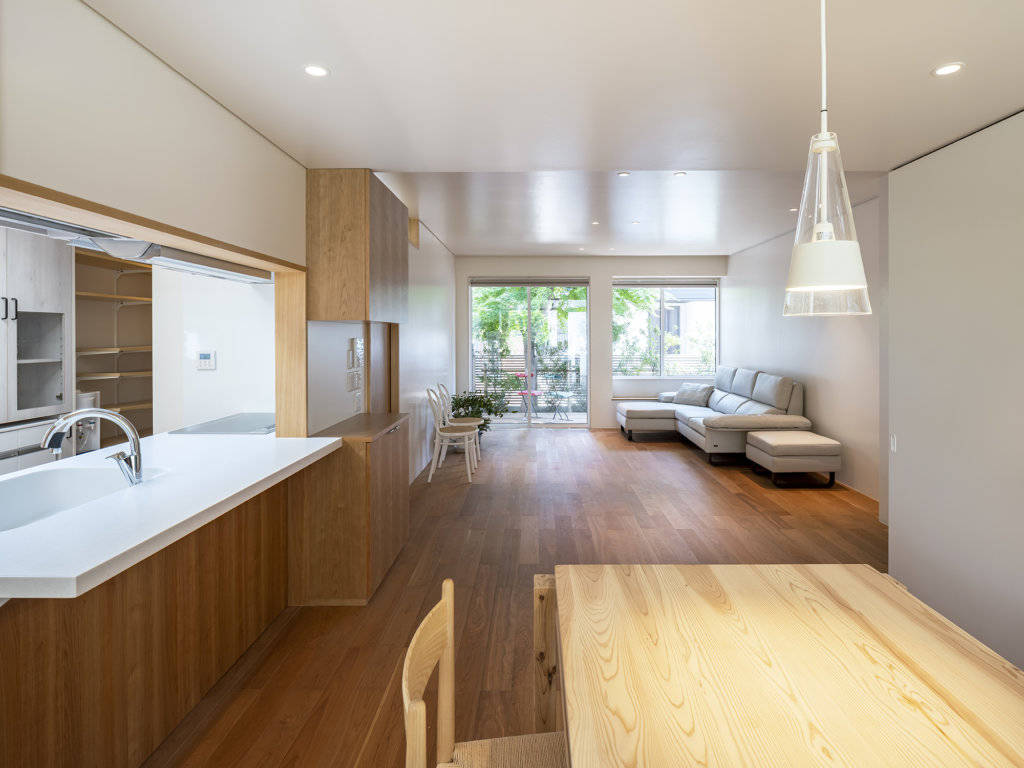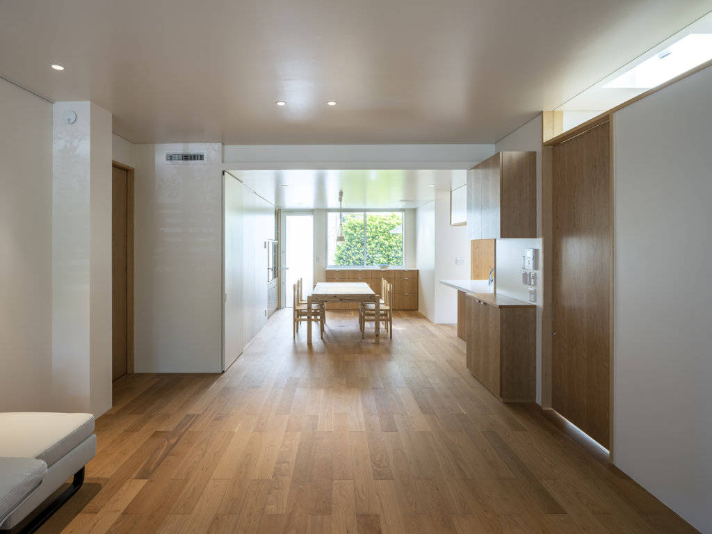 1階のリビング・ダイニングは建物を南北に貫くがらんどうな空間とし、家の中心となるよう設計した。室内建具をすべて引戸としたため、外部建具も合わせて開けることで、家全体に風通しができる。
