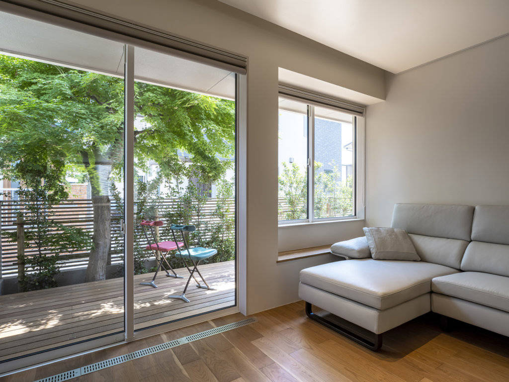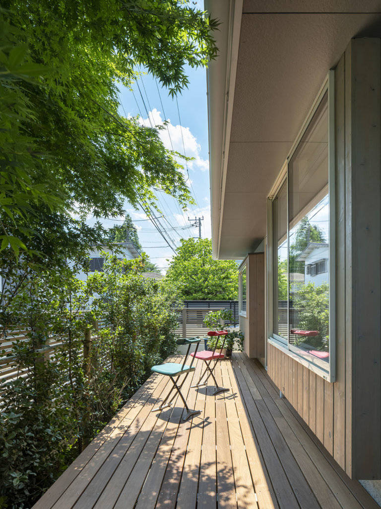 建物の南北東それぞれに庭・植栽スペースを設けた。さらに2階寝室にも隣接するテラスがある。敷地南端に元々あったイロハモミジの樹を保存し、3つの庭それぞれに植栽を施した。道路、隣家から少しだが引きをとって緑を配置し、生活に豊かさを与えることを狙った。