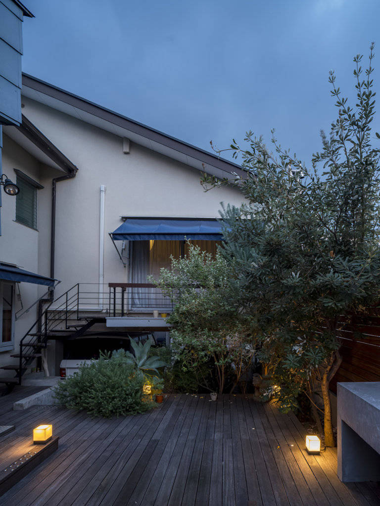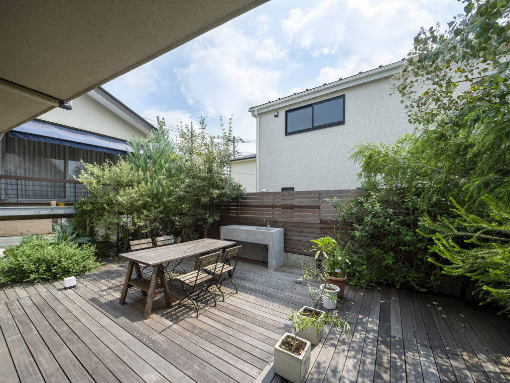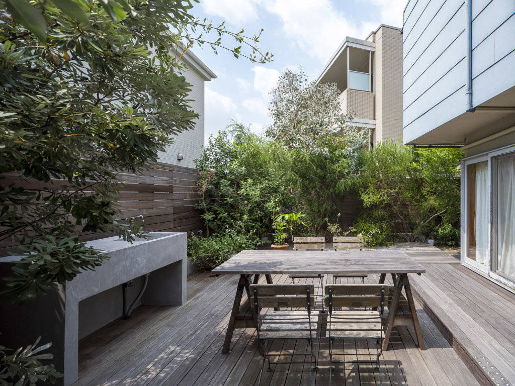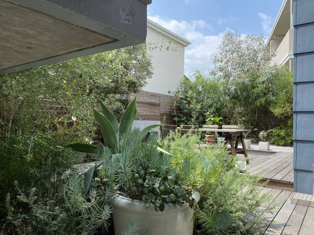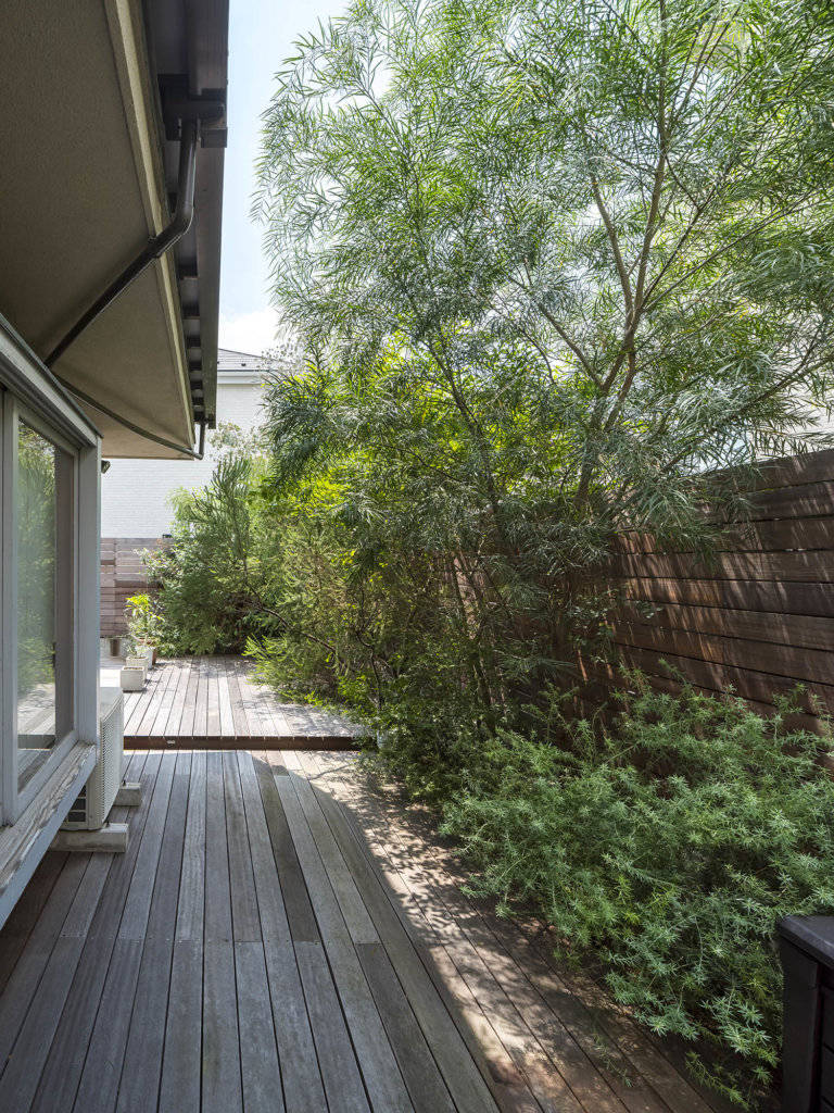 庭はイペ材によるデッキと塀で構成した。中央は一段低くし、人が集うスペースとした。植栽は建築主が主にオーストラリア原産種を選ばれ、細やかな葉が爽やかかつドライな印象を与える庭となった。