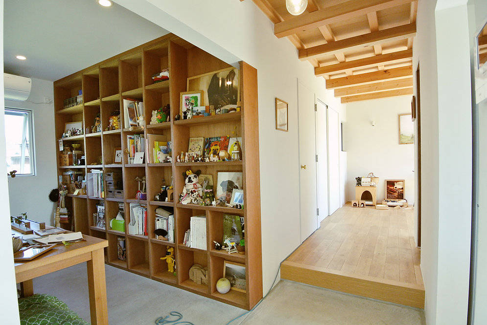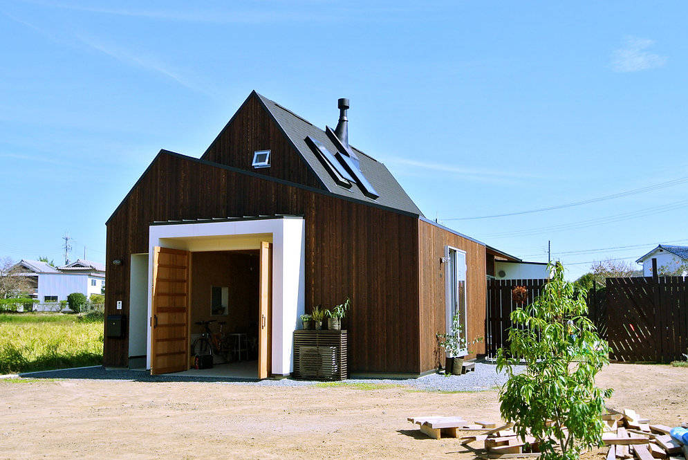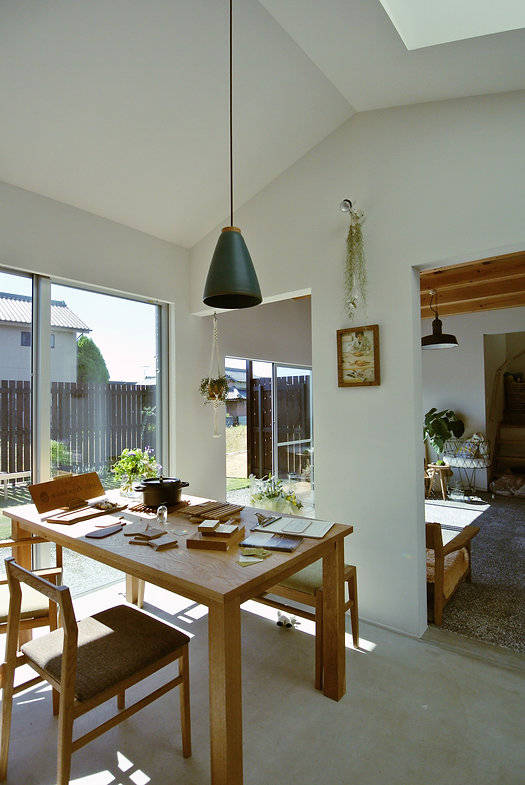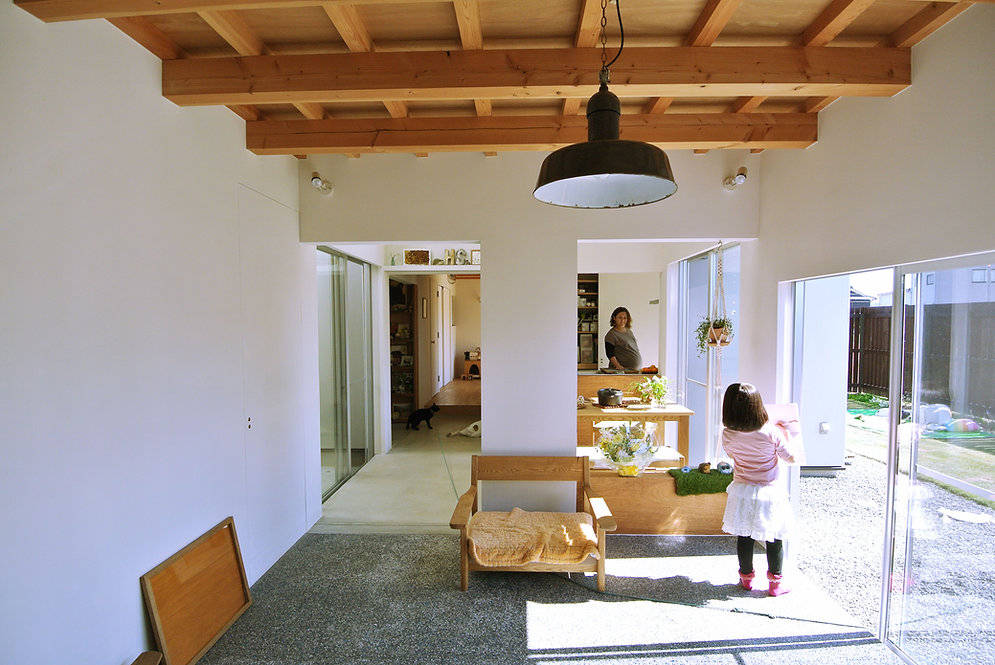 夫婦、3匹の犬、1匹の猫が住まう家である。犬や猫が自由に動き回れる家にしたいということ、四方が田畑であり開放的な印象のある敷地の中で、農作業者からの視線に配慮した設計とすること、この2点が建主からの要望であった。