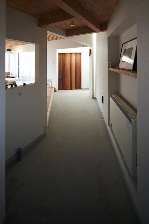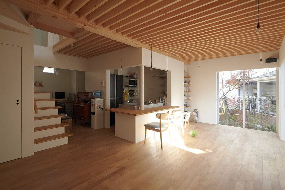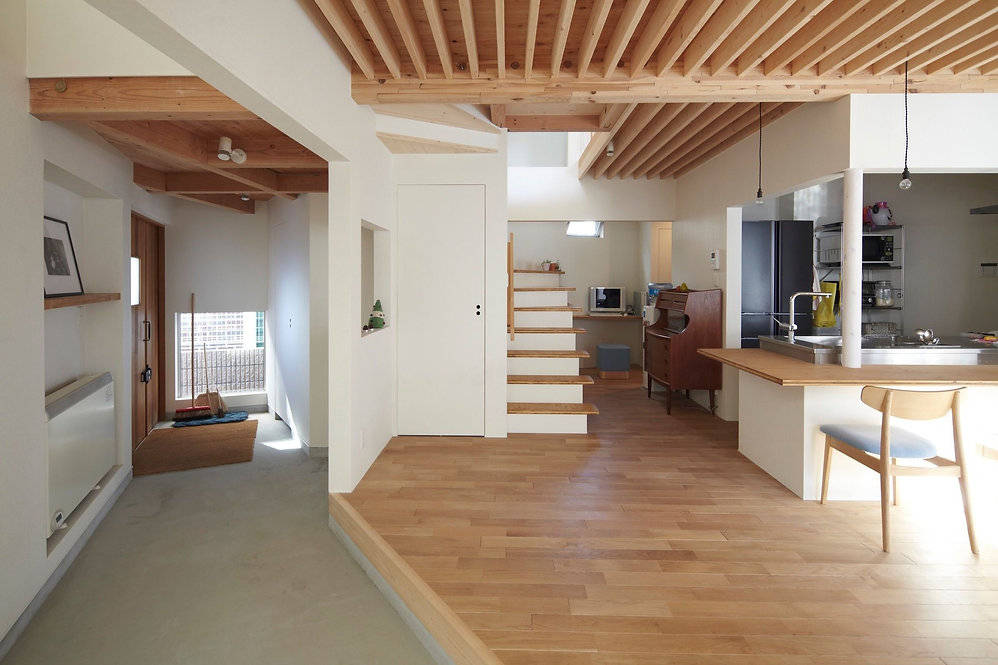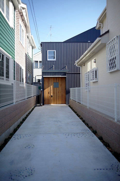 敷地は、比較的新しい住宅街、いわゆるベッドタウンと呼ばれる場所にある。前面道路から10mほど敷地内通路を介し、4方向全てを隣家の壁で囲まれた旗竿敷地である。周囲の住宅は、誰が決めたかわからないルールに支配され、窓は同じ方向を向き、庭は同じ場所に取られて並んでいる。しかし、少し角度を変えて観察すると、東南に正対するこの敷地には、隣地の建物と庭の隙間から、朝や昼、夕方にそれぞれ異なる方向から光が差し込んでいた。つまり、旗竿敷地においては、周囲と並列させずに隣地の隙間から距離をとることが「居心地の良さ」を生む重要なポイントになると気がついた。