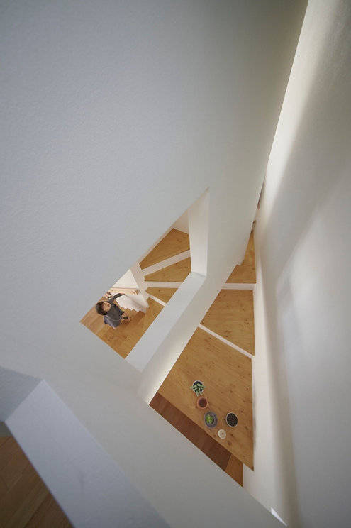 そこで、東西南北に向いた四角いボリュームを隣地の隙間から距離をとって配置し、残りは敷地の形状に沿ったボリュームと重ね合わせた。敷地を訪れた時に感じた光の入り方と同様、内部でも2つのボリュームに少しだけ距離をとり、隙間を設けた。その結果生まれたのが、三角形の庭2つと、スリット状に差し込む光。外部においては、周囲の住宅に圧迫感を与えないようにし、隣家の隙間から光を取り込む。その結果、2つのボリュームの隙間から家中に光を落とすのである。