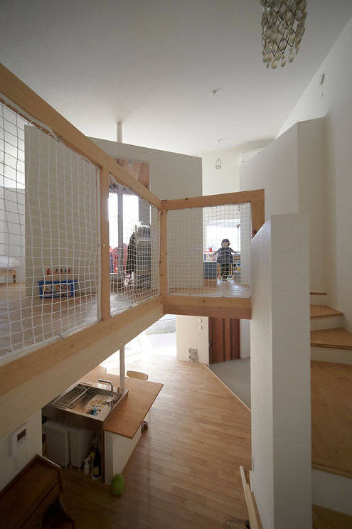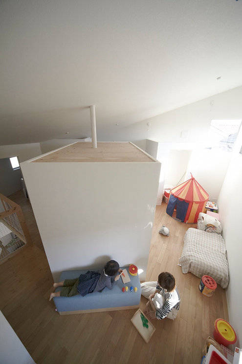 一方、内部空間では角度を振った外観の構成とは別のロジックでプランニングを行った。それは、これから変化していく、家族と暮らしに対応できる住まいにするためである。玄関ーリビングー寝室 という距離の序列は、家の中にある公私を決める大切な要素である。特に、家の中でもっとも大きい場所となるリビングとそこにつながる庭は、奥行きを持つ空間をつくりだす最も重要な関係となる。2階の個室空間は角度を振った壁によって大きさと開放度の異なるスペースをそれぞれ計画し、暮らしの用途と変化に合わせて使い分けられるようにした。最後は夫婦2人の空間として大きなワンルームに戻すことも可能なように、内壁は構造と切り離した壁(パーテーション)になっている。