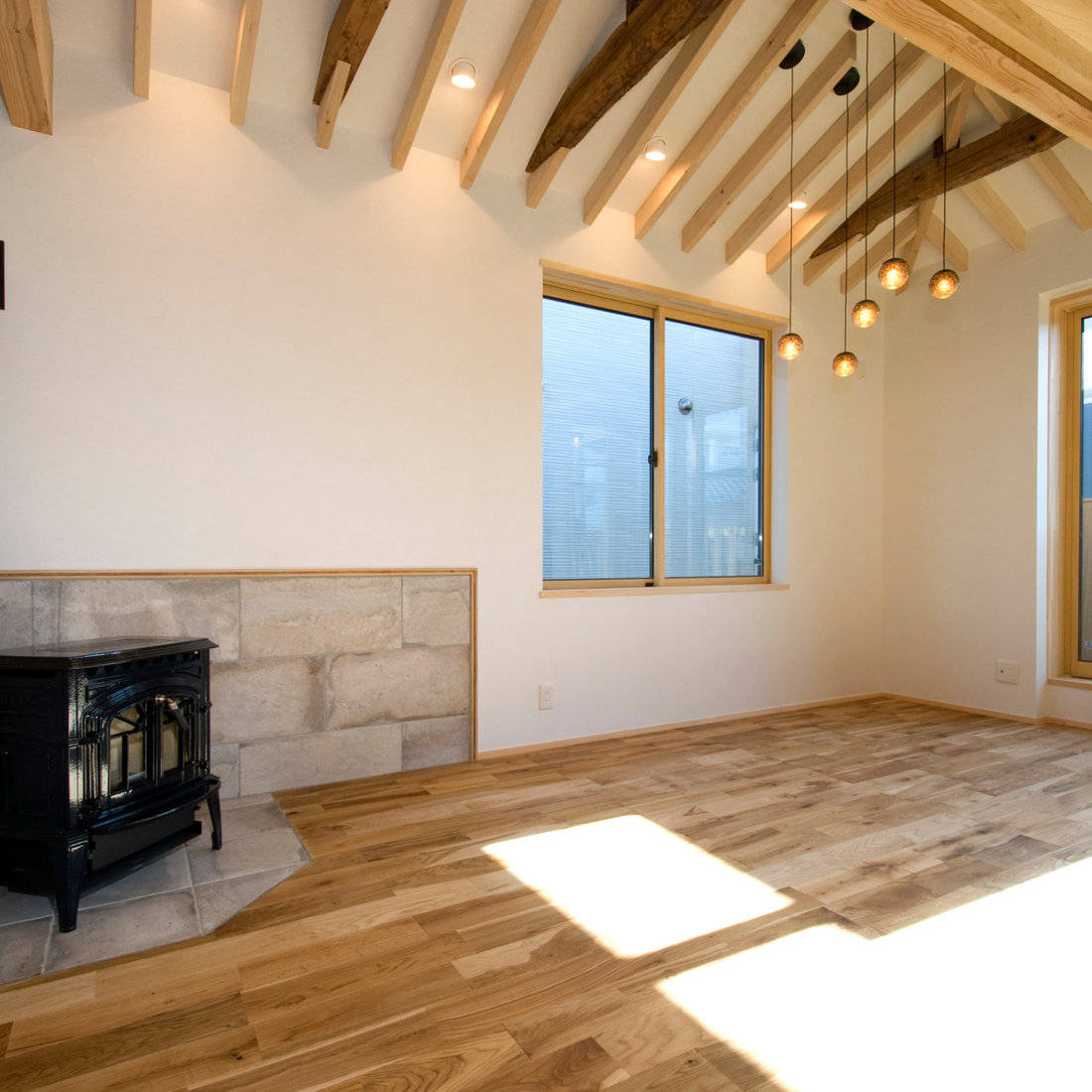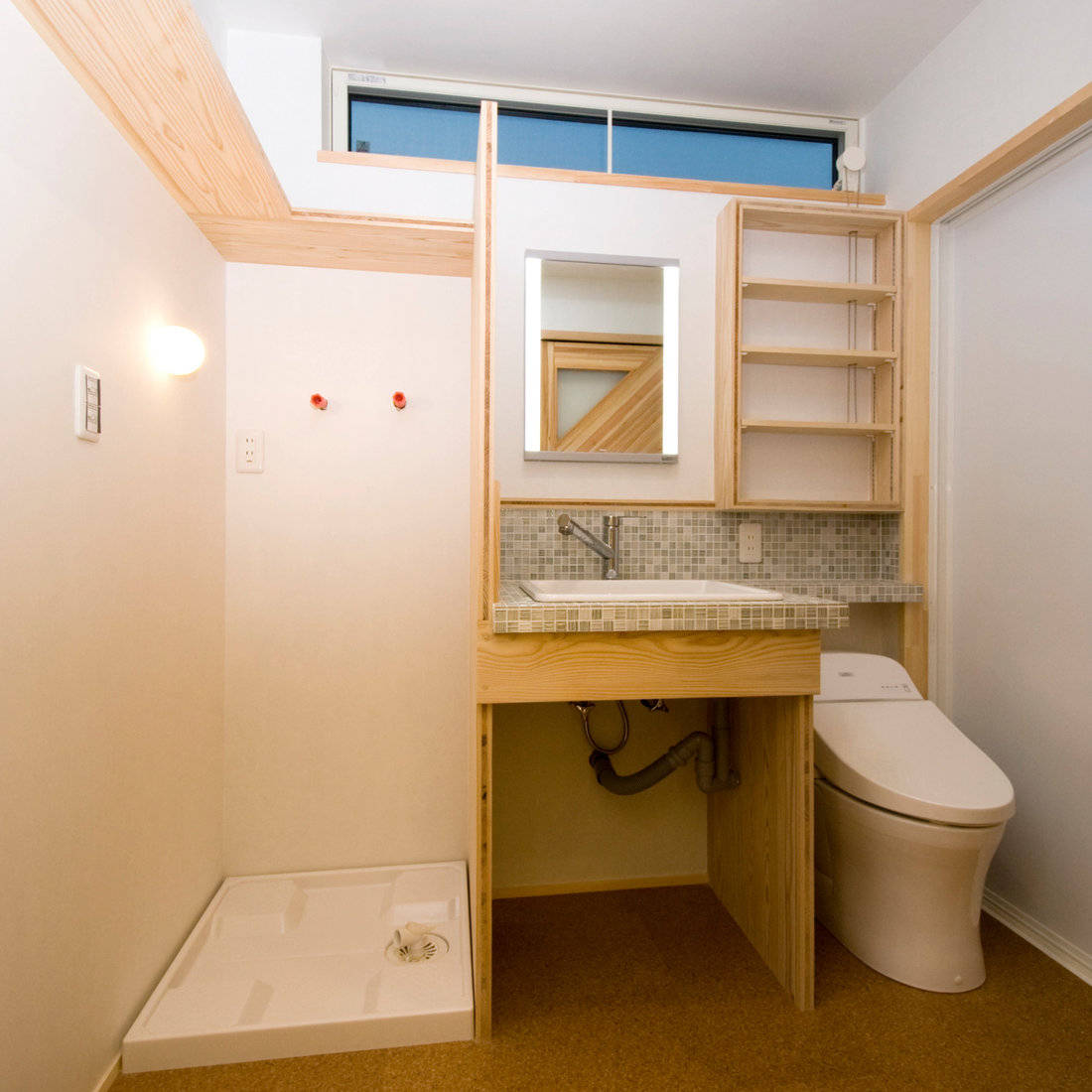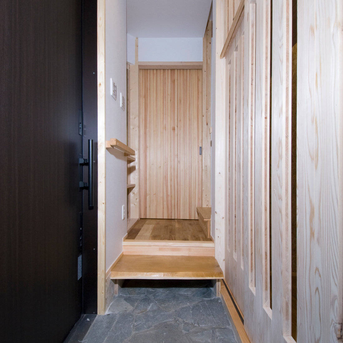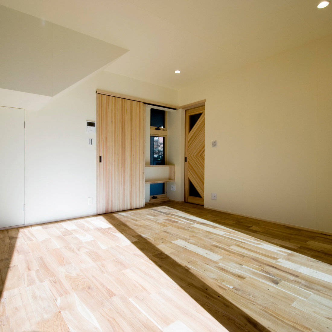 地域コミュニティの方々に広く開かれた場を作っていきたい、というお施主様のご要望により、訪問者もくつろげる空間をしつらえた。既存の駐車場をポーチ兼人が集える場とするような設計の工夫をした。またお施主様のご希望で寝室の壁には京都の和紙を採用。