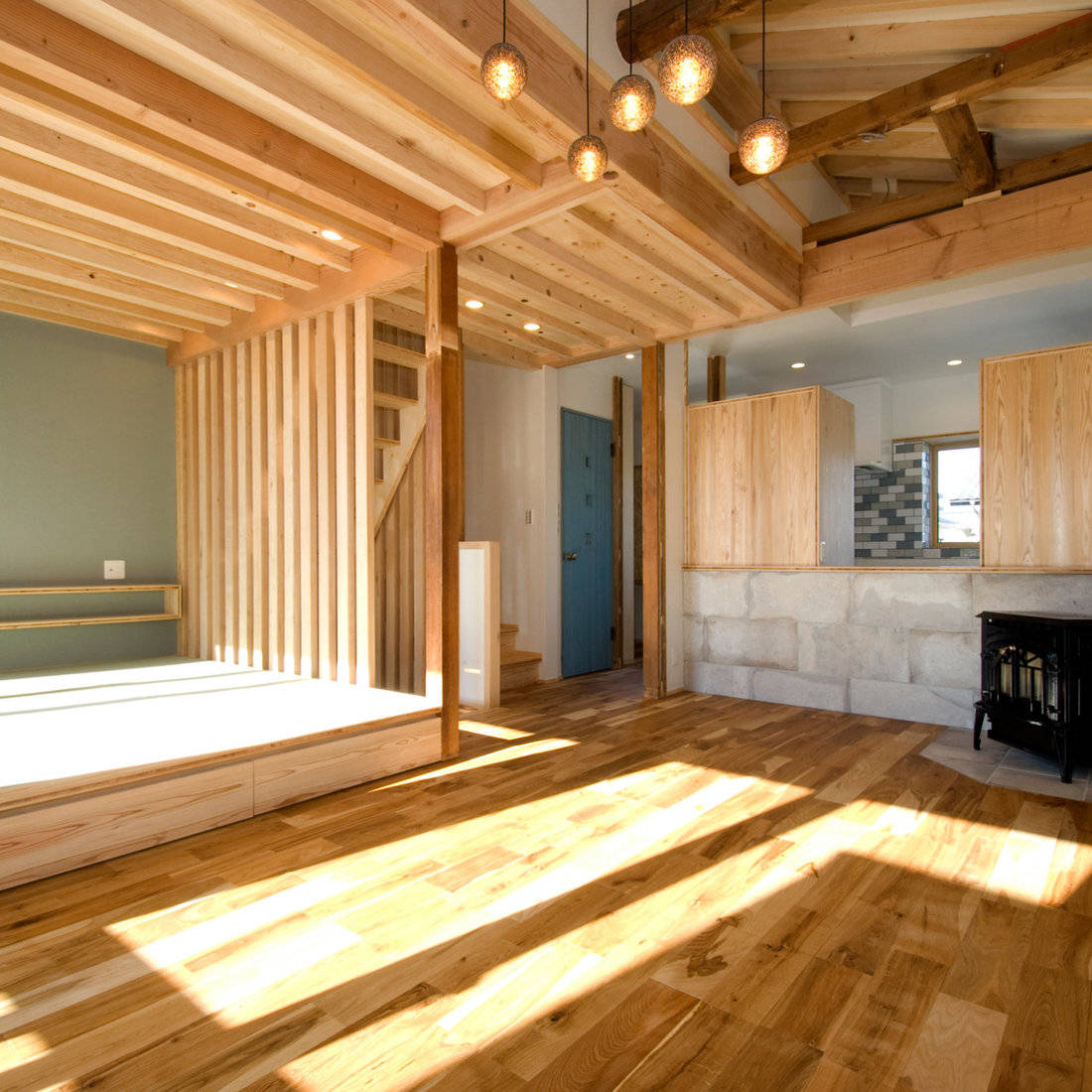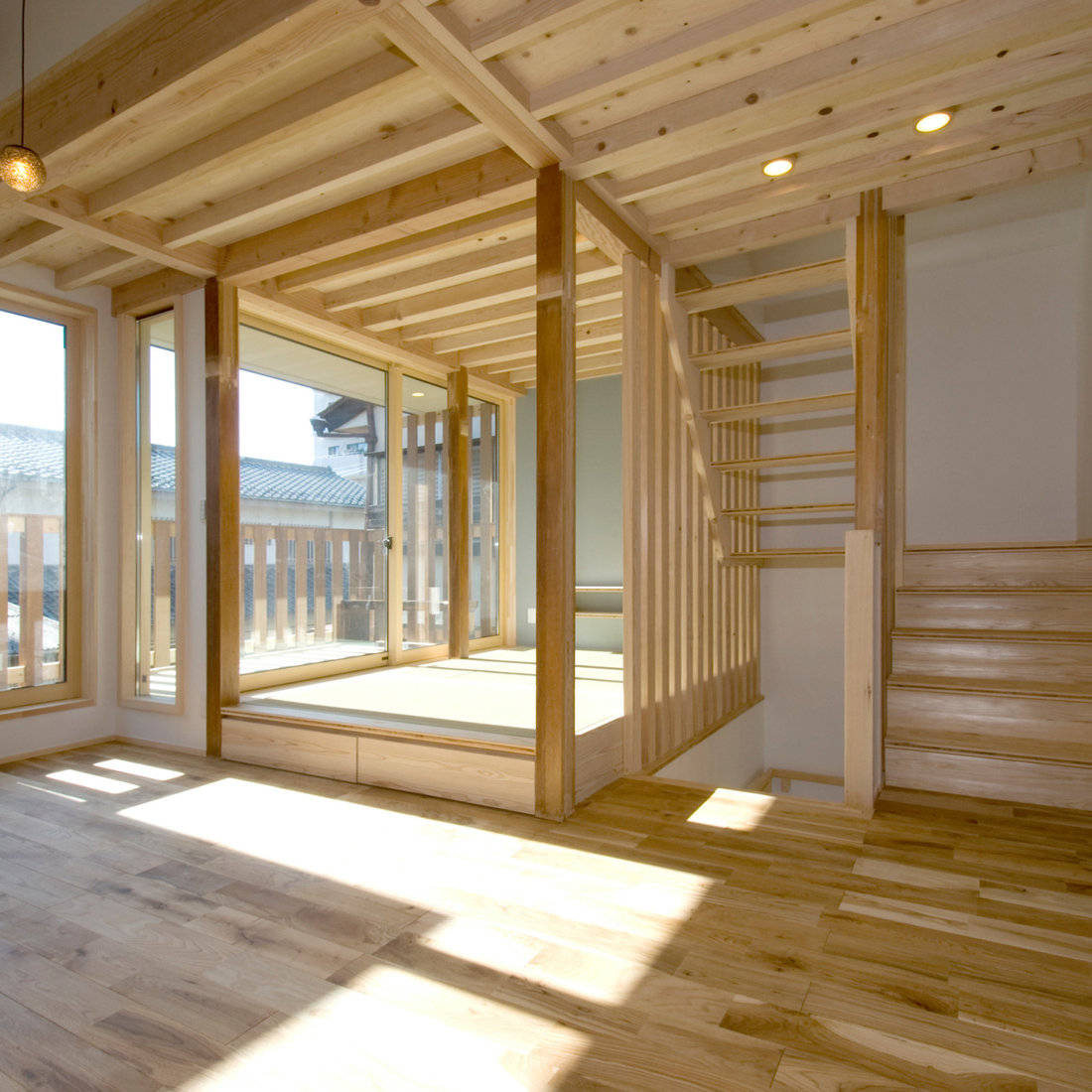 階段空間を格子状にすることによって開放的な空間とした。通常考えられるよりも階段の段数を増やしたり、階段の途中に踊り場を設けるなど、高齢の方への配慮とした。また温度差を減らし、ヒートショックを防ぐように、部屋ごとの仕切りを最小限にした。