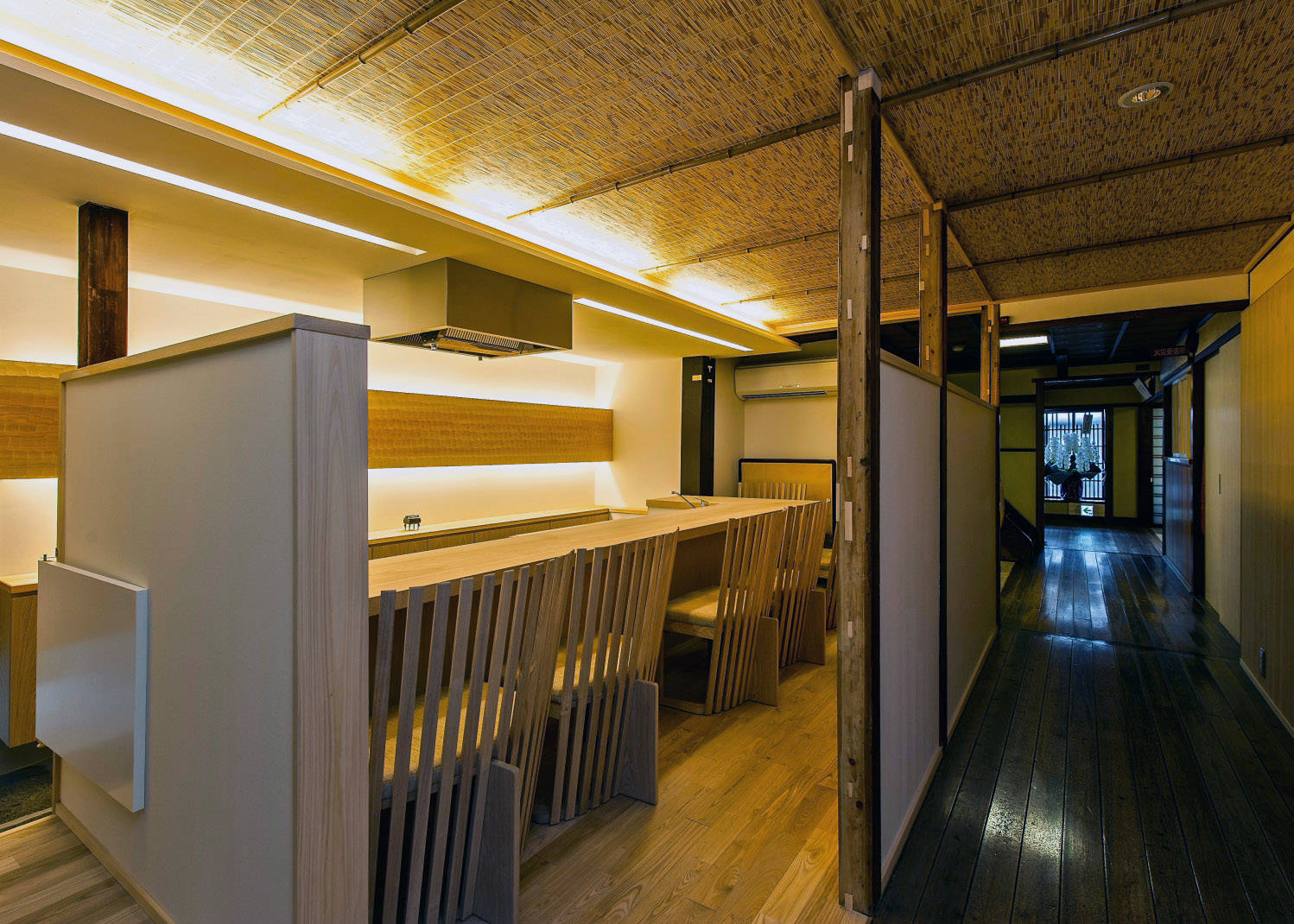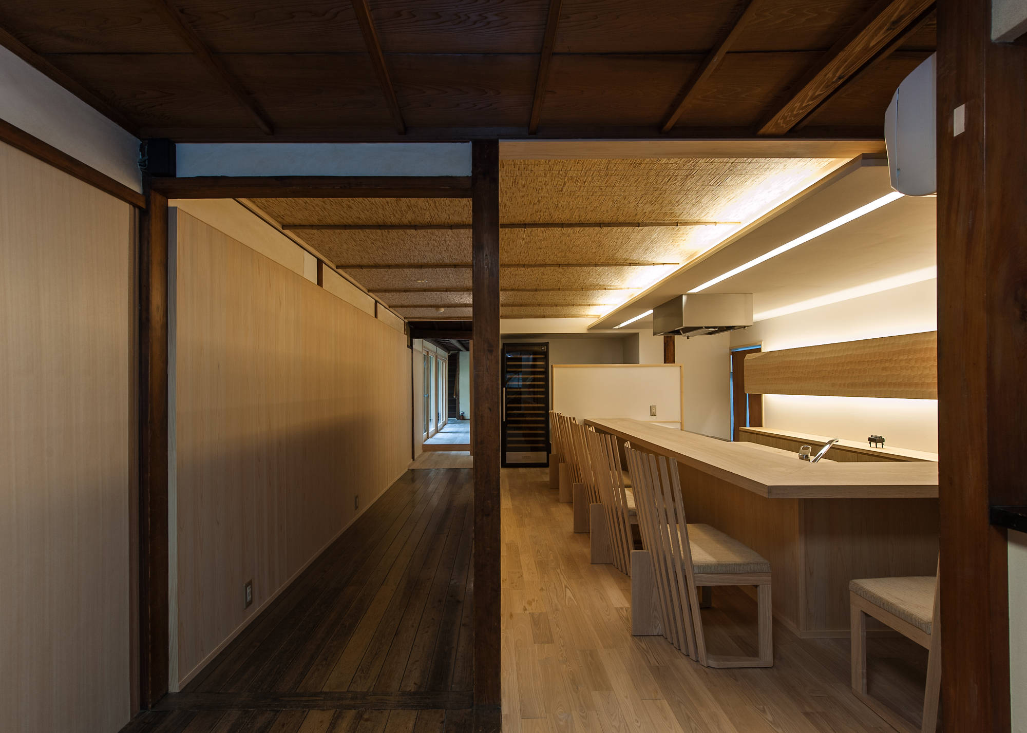 新しく挿入したのは、外部から訪れた客が食事に利用する空間だ。この食事の空間は、正面の壁に付けたナグリの1枚の厚板が場の存在感を増す。この板は間接照明の役割を担うと同時に木の持つ暖かさを感じさせ、チョウナをつかい人の手で削られたウロコ模様が、食事する人に不思議な安らぎを与えてくれる。客と亭主の間を何も遮るモノはないが、厚手のタモカウンターが無意識の境界を造っている。背面には、百年以上使われた柱と床。天井は廊下とつながり、空間の対比は新たな時間の出発を意識させるものだ。