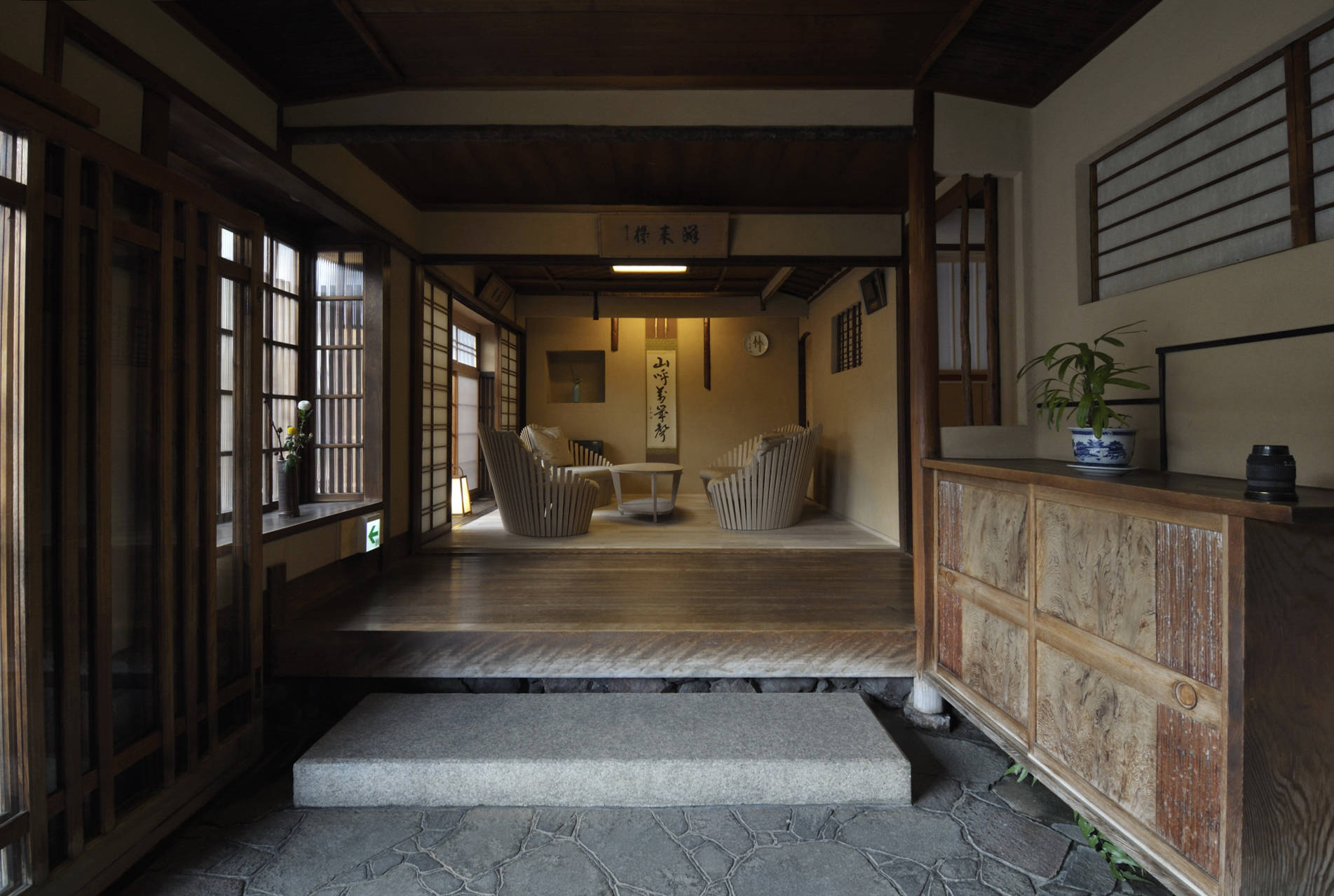 築百数十年経過したこの旅館は、今までにない使われ方を提供できる「旅宿」としての新しい歴史を得た。構造体としての梁・柱、さらに既存の壁も動線に干渉しない限りできるだけ残した。百年以上を経た床板の床鳴りも、耳に楽しいBGMとして取らえほとんどを残した。