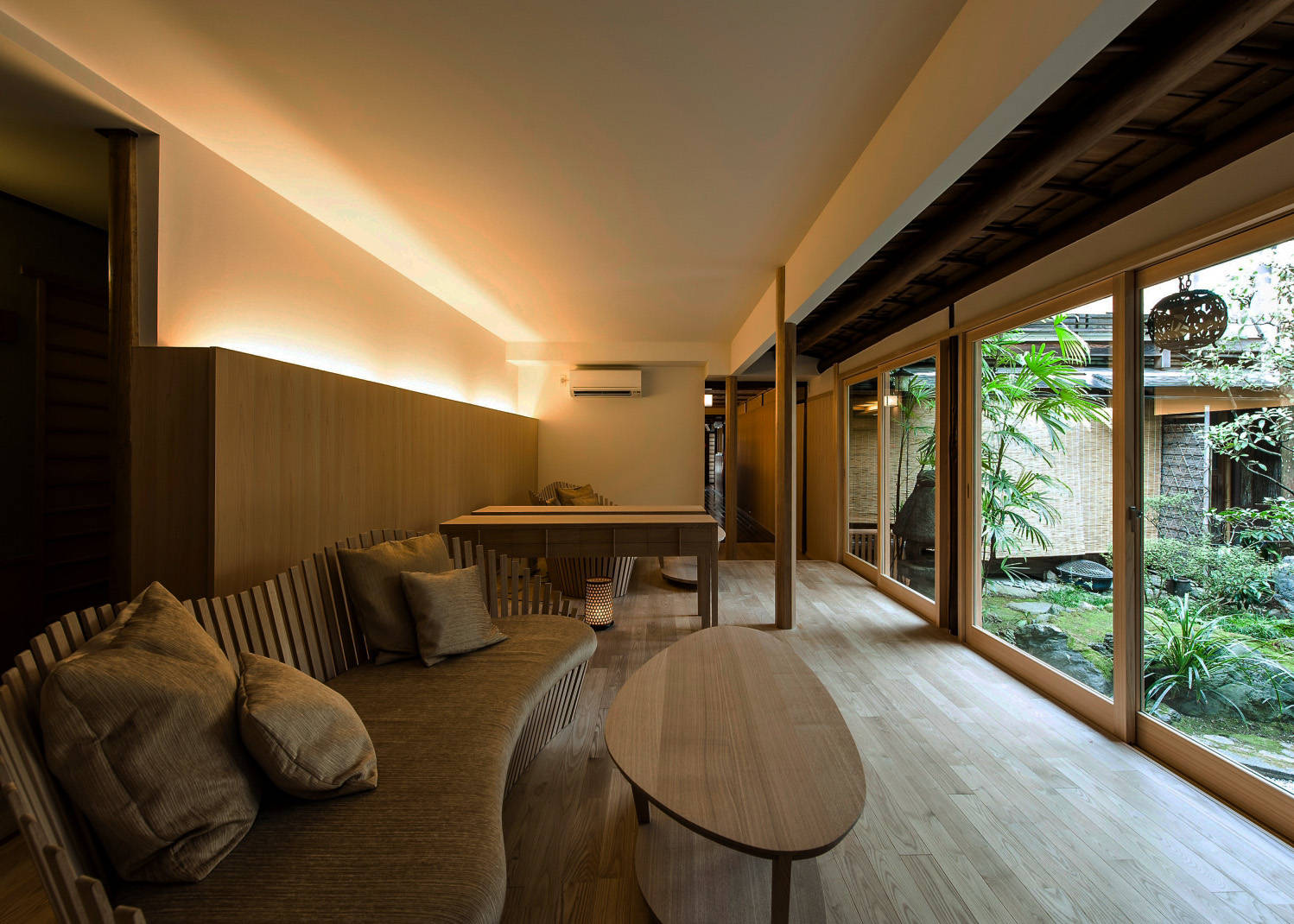もうひとつ挿入された新たな空間は、元浴室だった場所に設けられたライブラリーだ。ここは宿泊客の憩いの場となる。歴史ある京の中庭に面したソファーに身を委ねれば、四季の移ろいを彩る庭が時間の流れを忘れさせる。